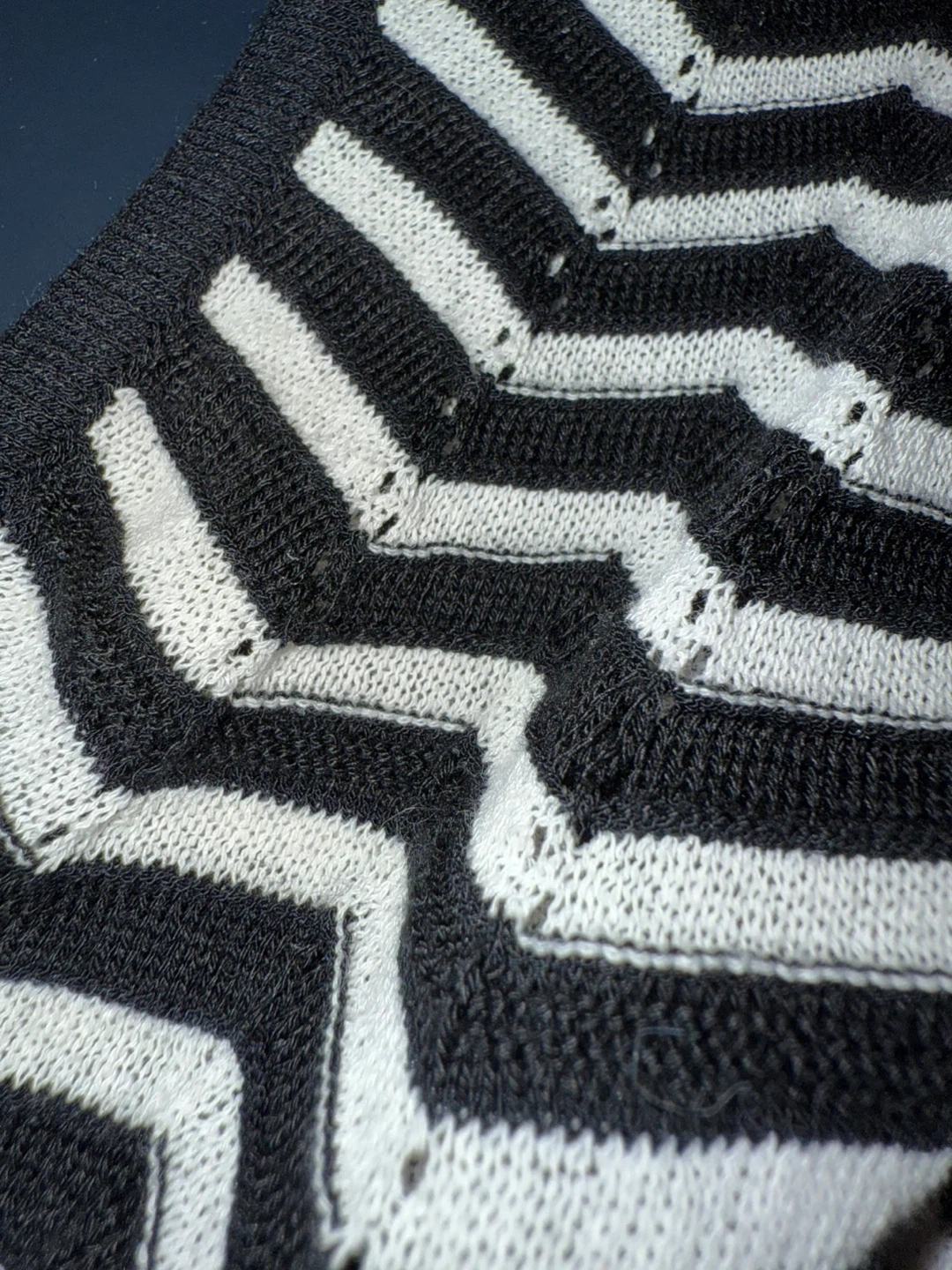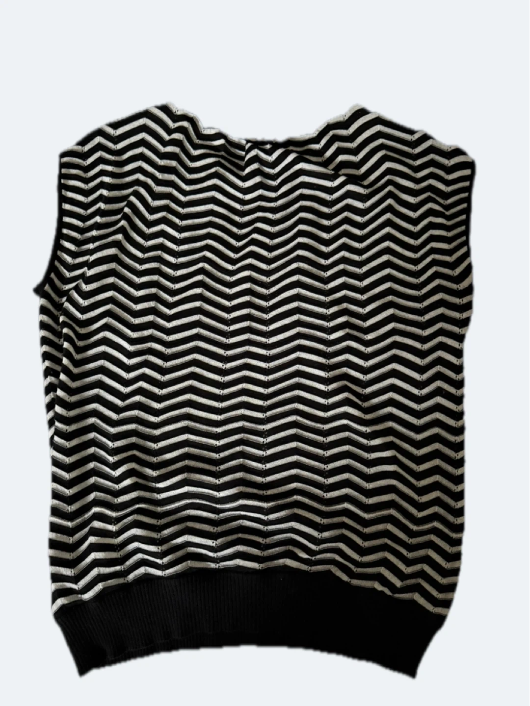 This sleeveless Missoni knit top features a classic black and white chevron zig-zag pattern. It's made in Italy and is a European size 40. It's a stylish piece for any wardrobe!