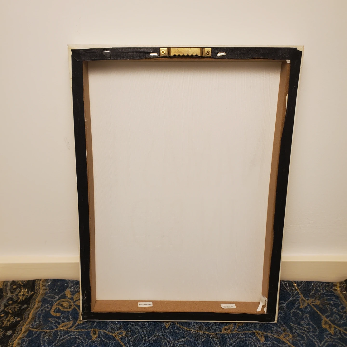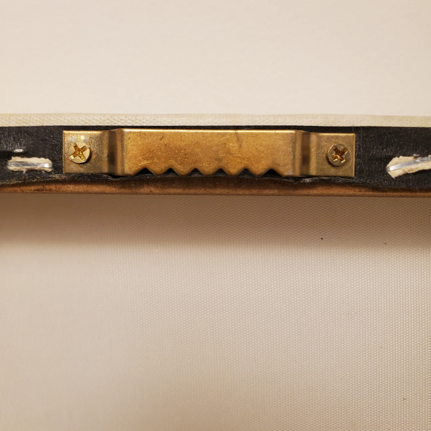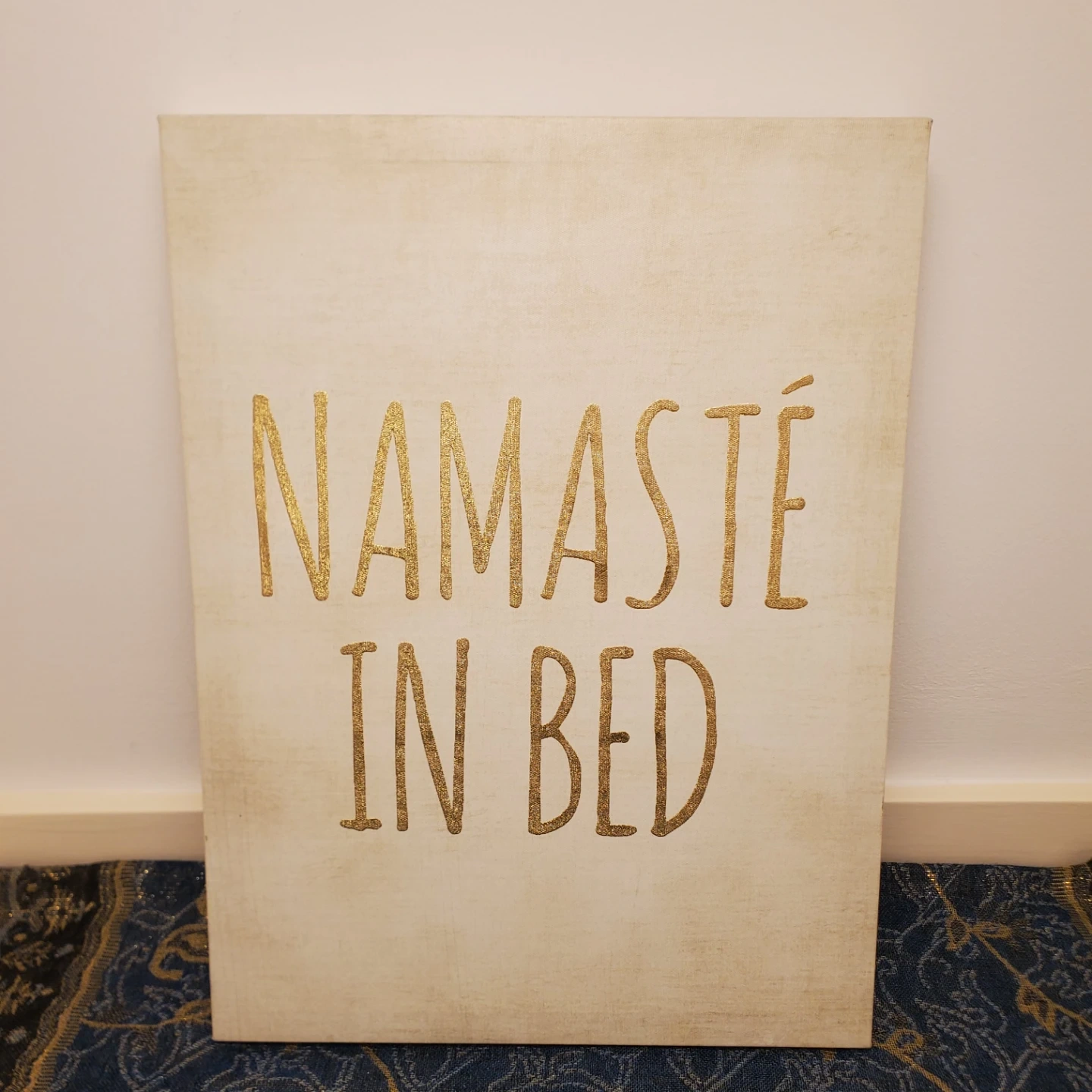 This canvas wall art features a "Namaste In Bed" design with gold glitter text on a cream-coloured background. It comes ready to hang with a sawtooth hanger attached to the back. Add a touch of zen to your bedroom! 16" by 1 ft.