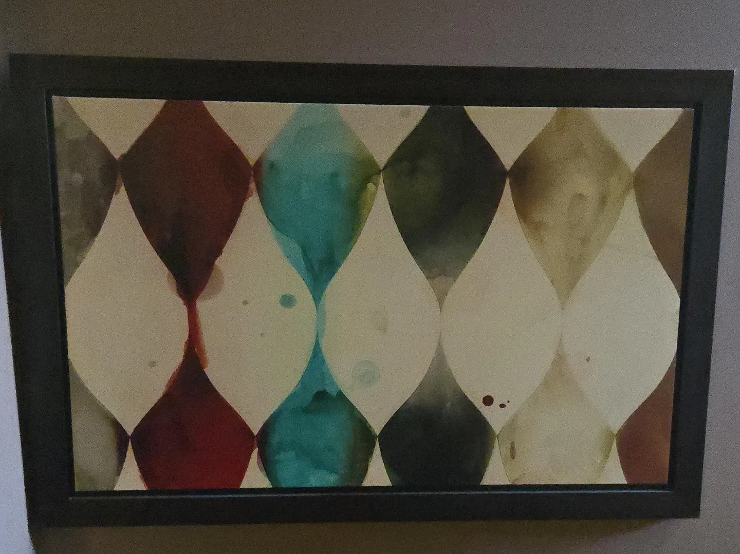 Framed watercolour painting with an abstract diamond pattern. Features a mix of earthy tones and teal. Some minor spots present on the artwork.