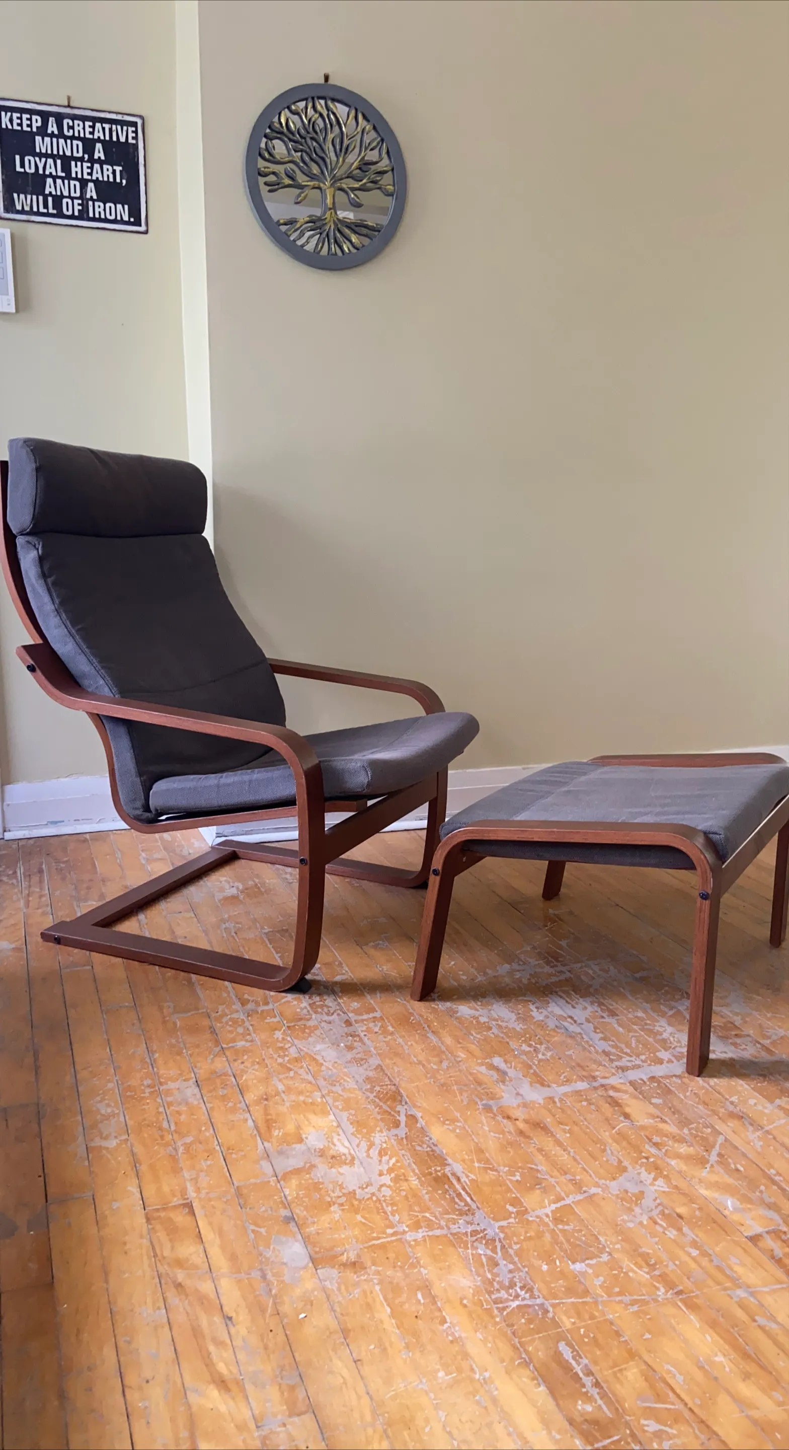 This is a grey IKEA Poäng chair with an ottoman. Stained wood frame and fabric upholstery. There's a small snag on the chair cushion. Great for relaxing!