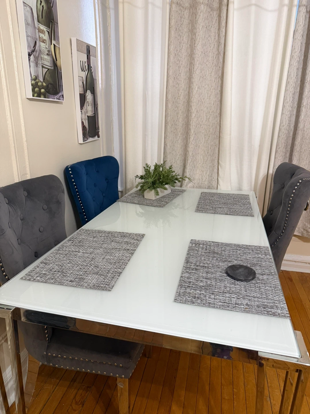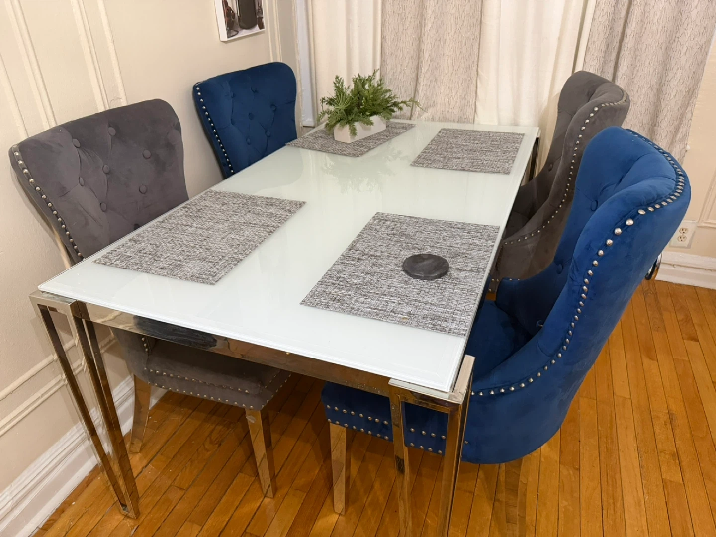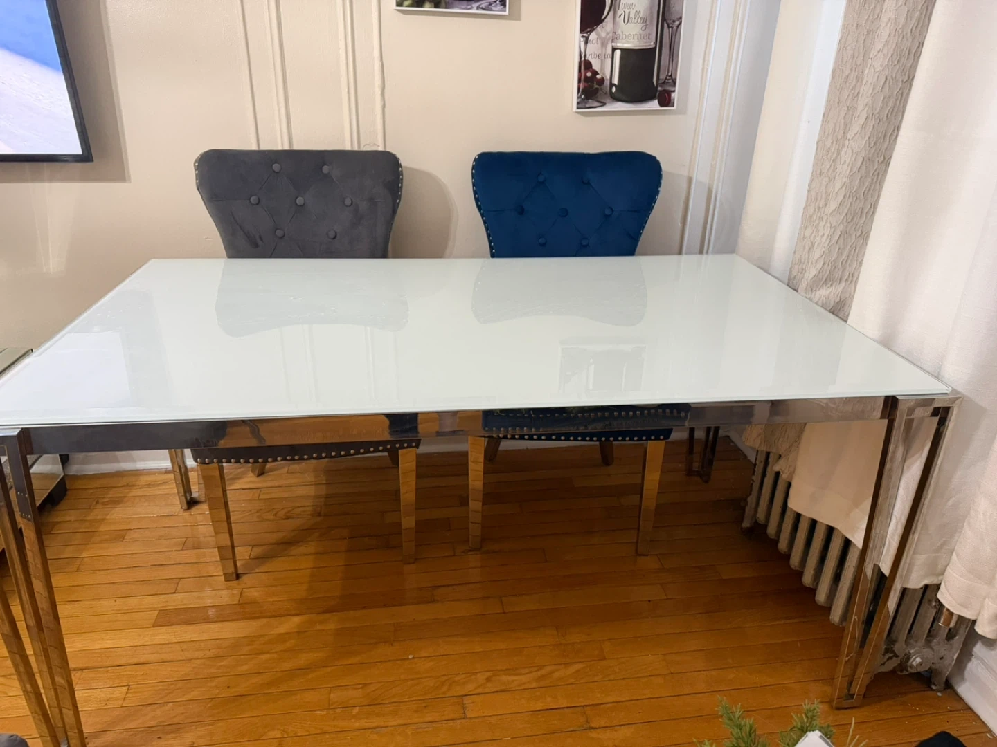 A sleek white glass top dining table with modern chrome legs. It's perfect for seating up to 6 people. The glass surface is easy to wipe clean.