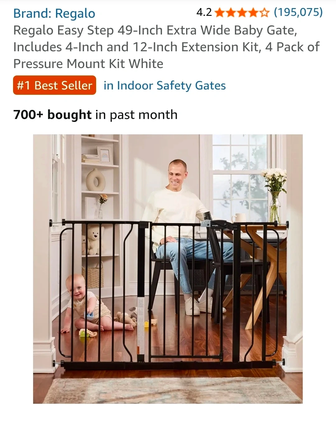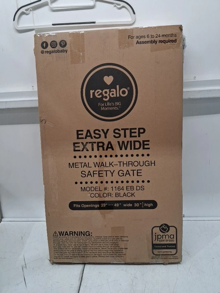 Keep your little one safe and sound with this new Regalo Easy Step Extra Wide Metal Walk-Through Safety Gate, designed for ages 6 to 24 months, fitting openings 29"-49" wide and 30" high. The model number is 1164 EB DS in black. Assembly is required.