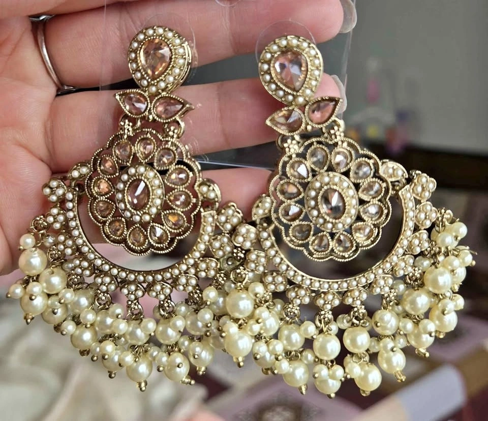 Add a touch of elegance to your look with these intricate Indian statement earrings. Perfect for festive occasions, weddings, or special celebrations, these earrings feature detailed craftsmanship and a charming design that complements any outfit. Lightweight and stylish, they make a wonderful gift for yourself or someone special.