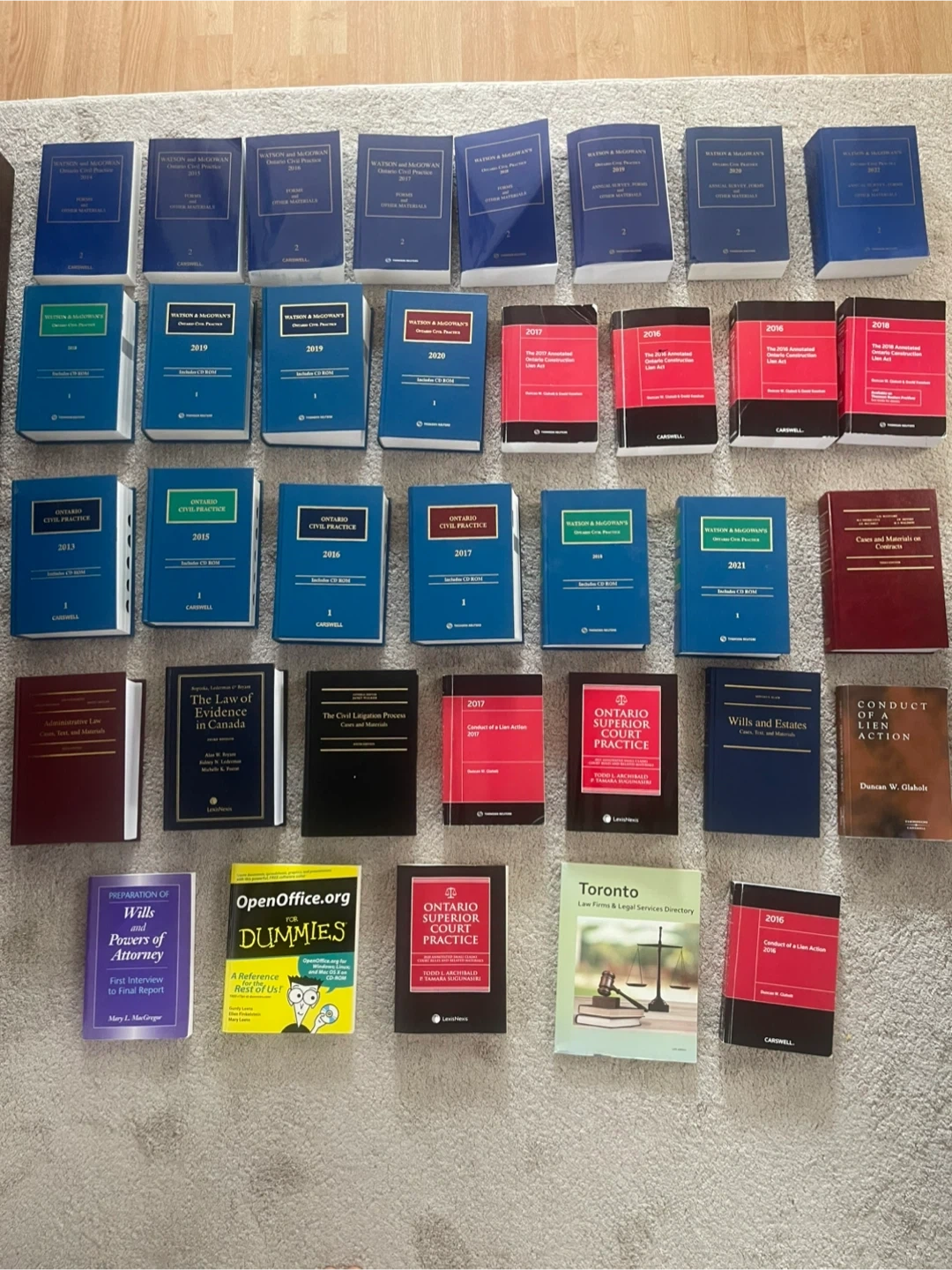 Collection of Canadian legal reference books, including statutes and practice guides. Most books are from 2015-2021. Includes titles on Wills & Estates, Civil Procedure, and practice manuals.