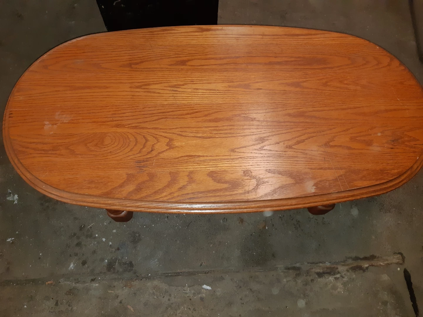 A classic wooden coffee table with a warm oak finish. It has turned legs and an oval-shaped top. This table is great for any living room!