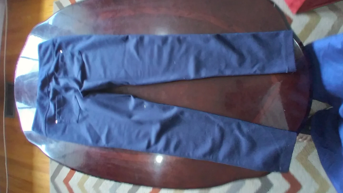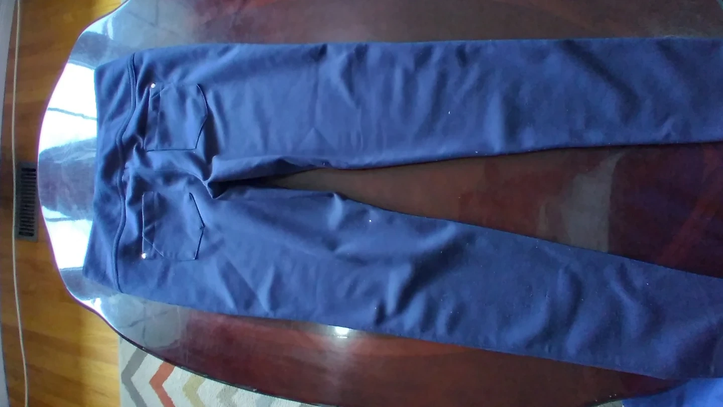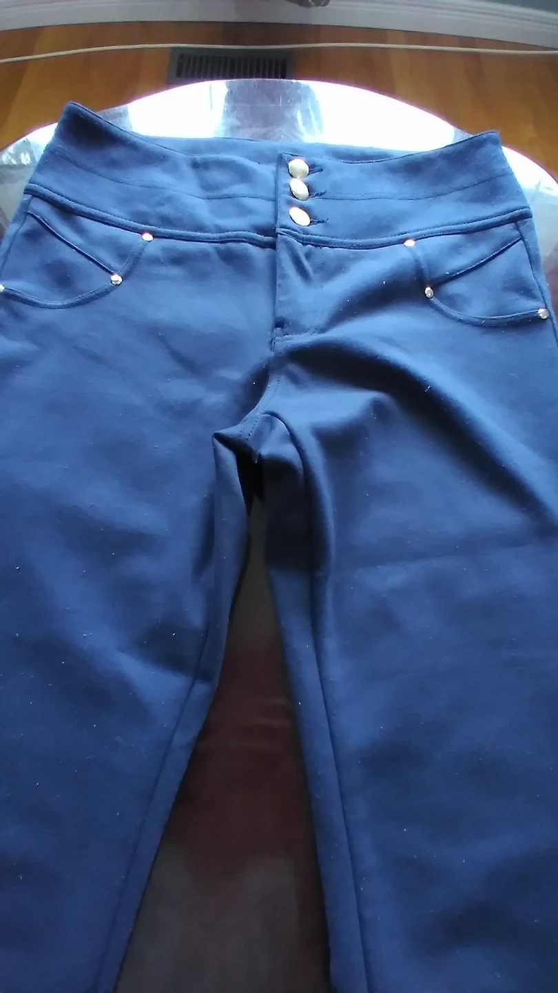 These navy blue pants feature a high-waisted design with a four-button fly. They have a slim fit and come in a stretchy material. Pockets on the front and back.