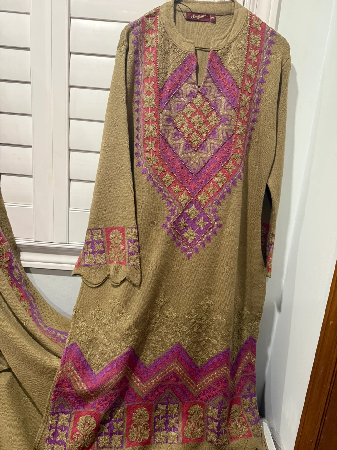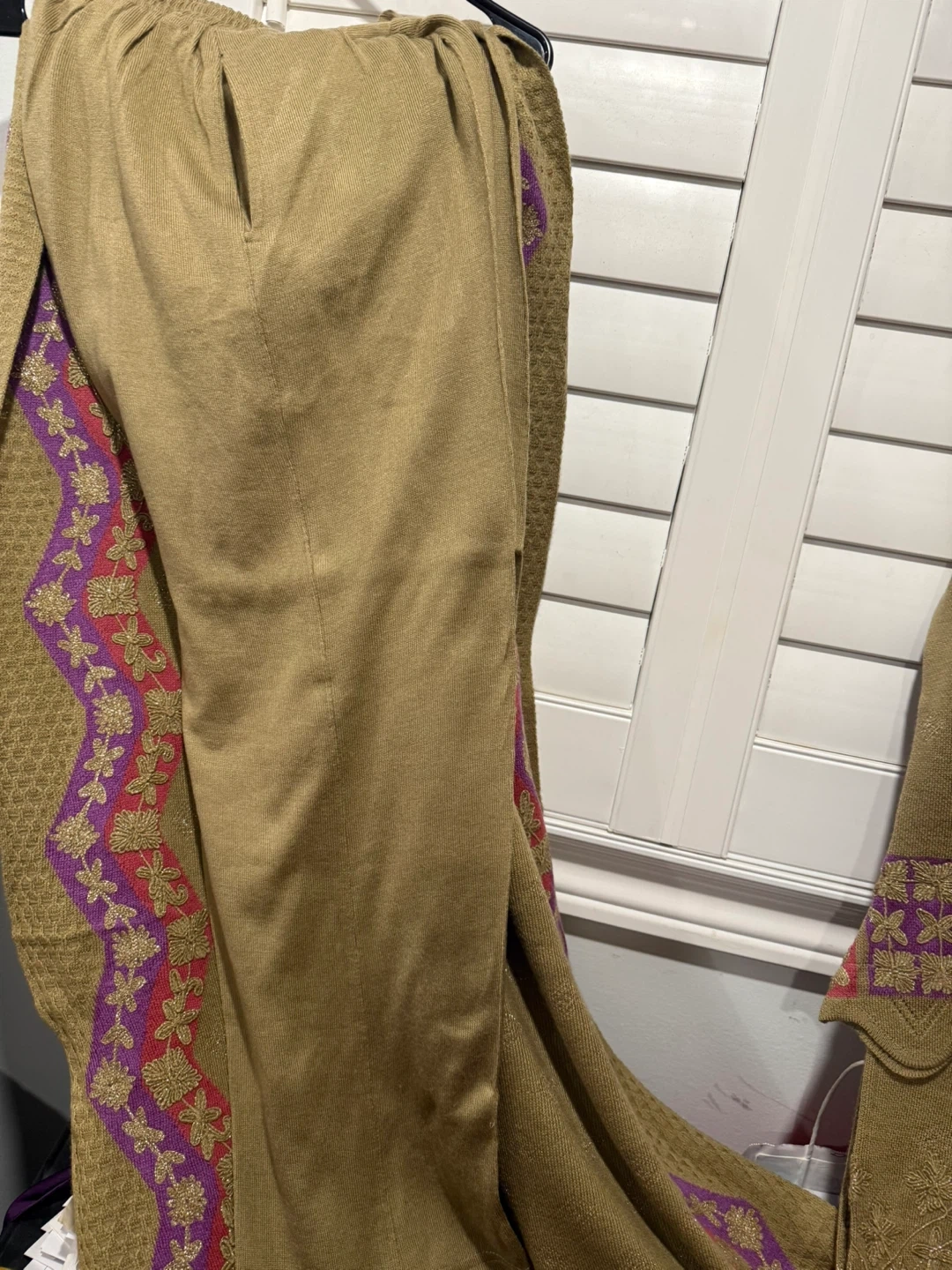 Selling a beautiful ladies' three-piece shalwar kameez suit. It's a size large and features lovely embroidery detailing in purple, pink, and gold on a tan background. Perfect for a special occasion or just feeling a bit fancy!