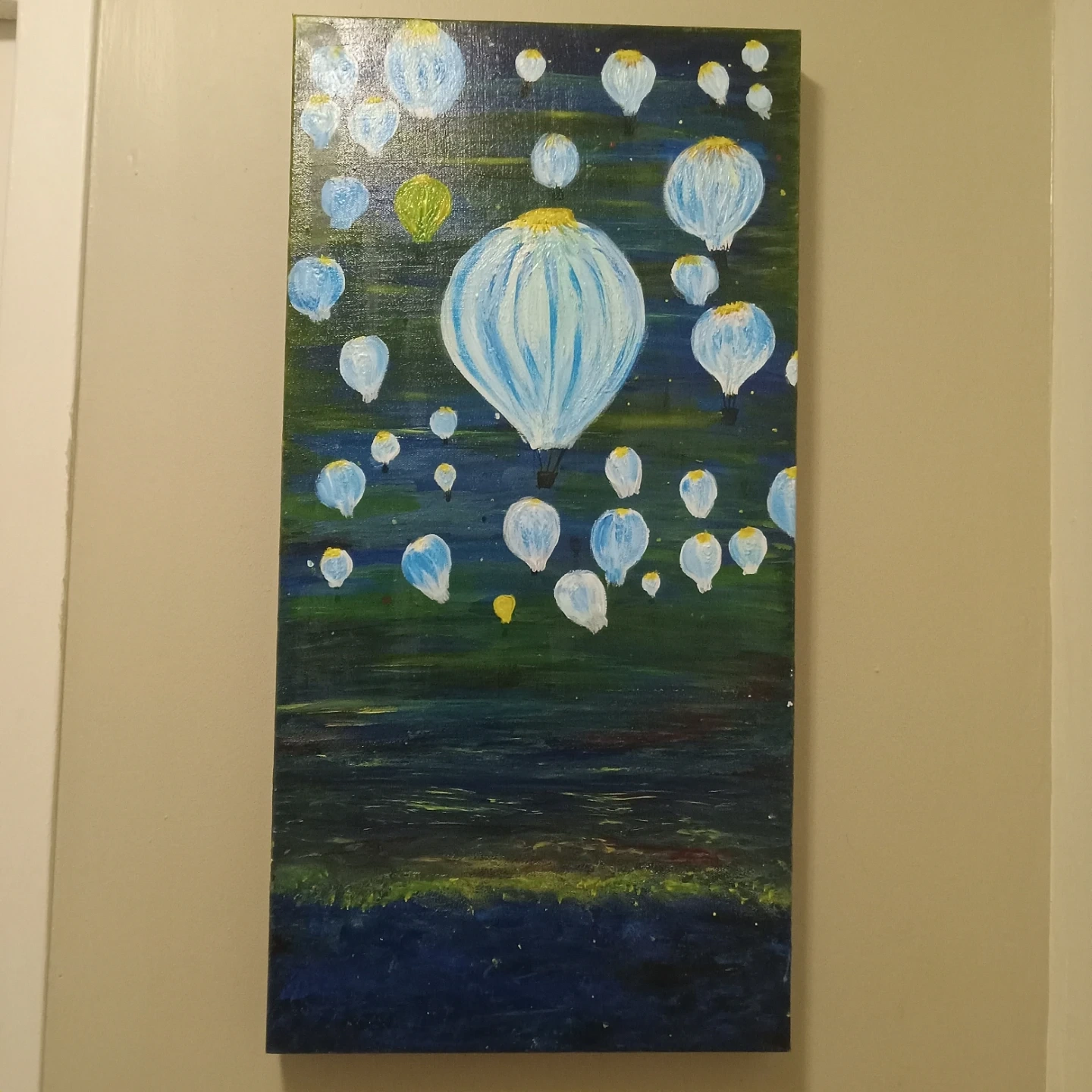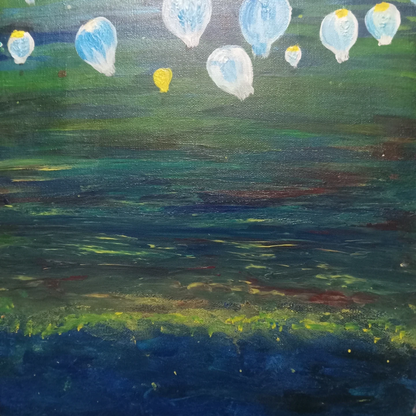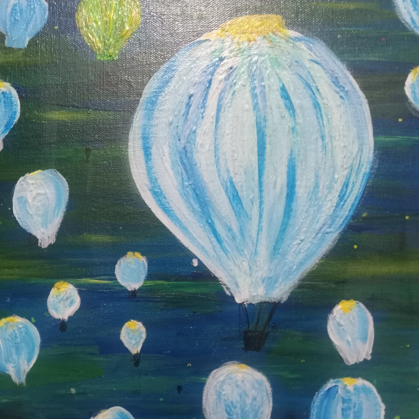 This is a painting of various hot air balloons floating in a dark, textured sky. The balloons are rendered in shades of blue, white, and yellow, with some appearing more detailed than others. The background depicts a landscape of dark greens and blues with hints of yellow and red.