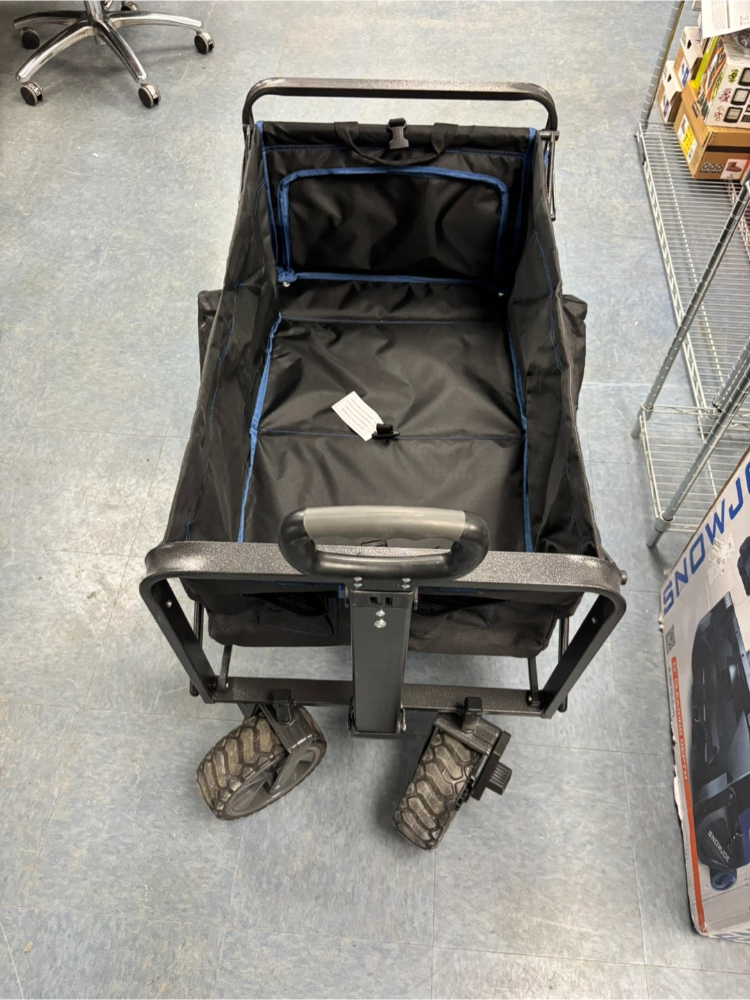 This black folding wagon is perfect for hauling gear. It features a sturdy metal frame and durable fabric. It's collapsible for easy storage and transport!