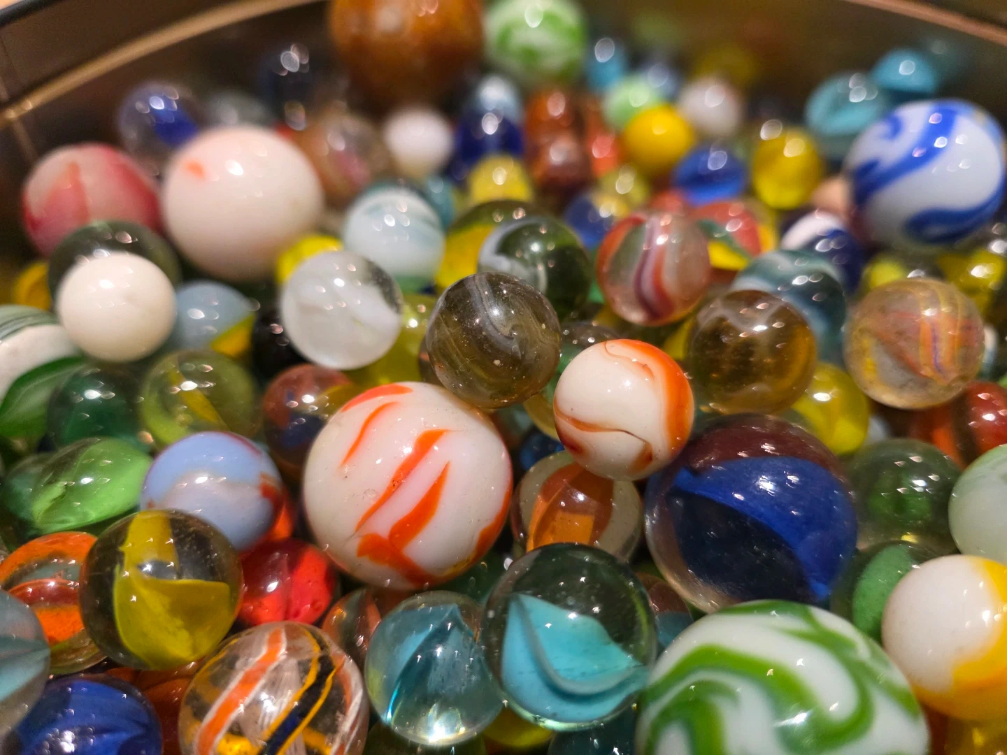 A large collection of colourful glass marbles in various sizes and patterns. These marbles are suitable for games or as decorative items. They come in assorted colours including blue, red, green, yellow, and orange.