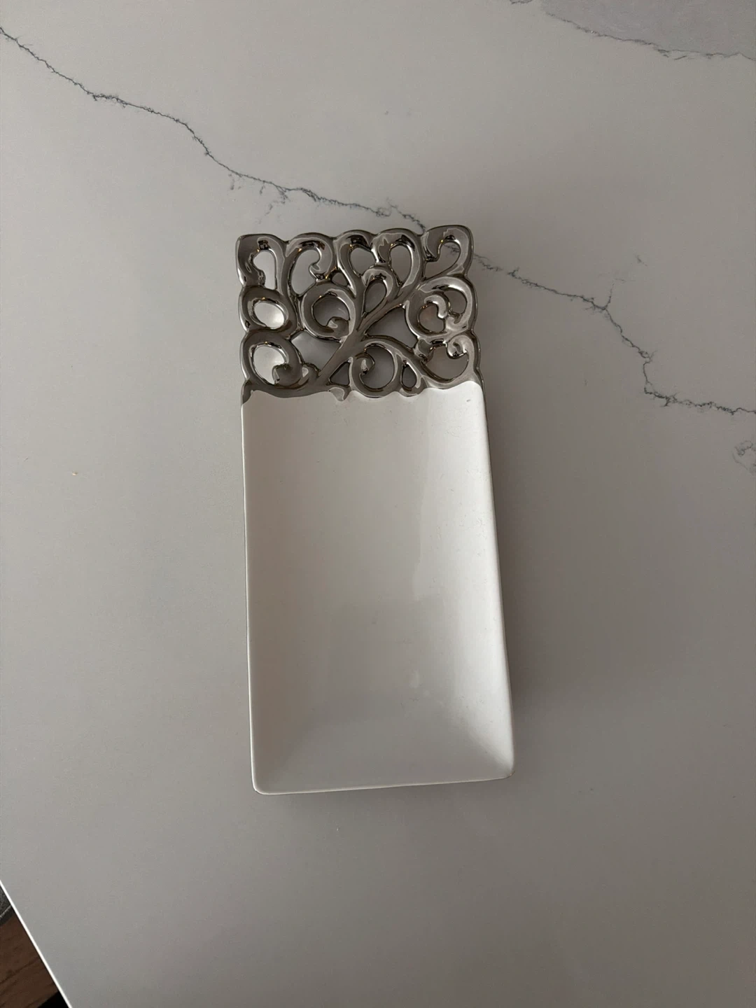 This is a rectangular white tray with a decorative silver metal accent. The accent features an elegant scrollwork design along one edge. It's suitable for serving small snacks or as a decorative piece. Ceramic and metal construction.