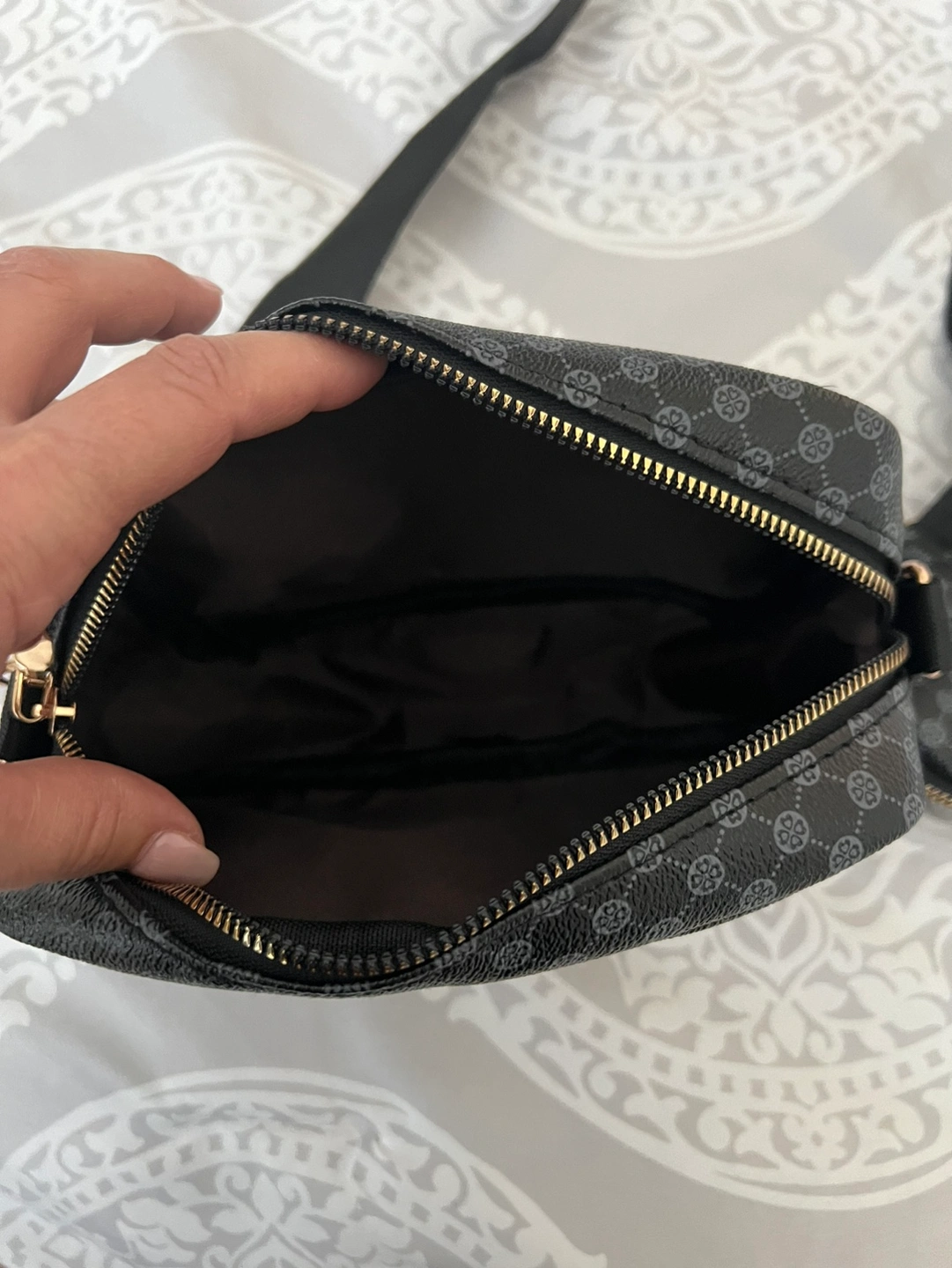 Black purse with an adjustable strap and a small coordinating coin purse. The purse has a zipper closure. The purse and coin purse have gold hardware.