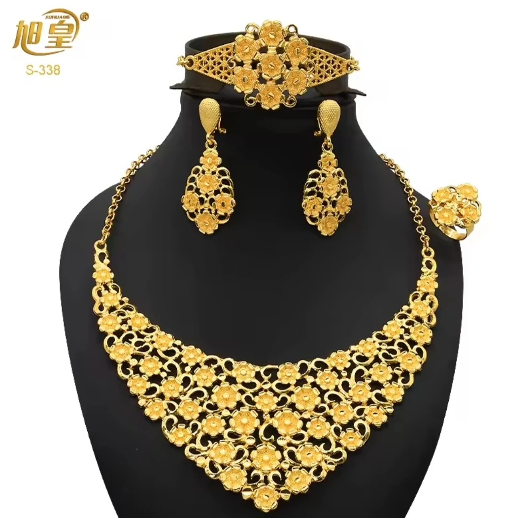 This is a Xiu Huang S-338 jewellery set. It includes a necklace, bracelet, earrings, and a ring. All pieces feature a intricate floral design.