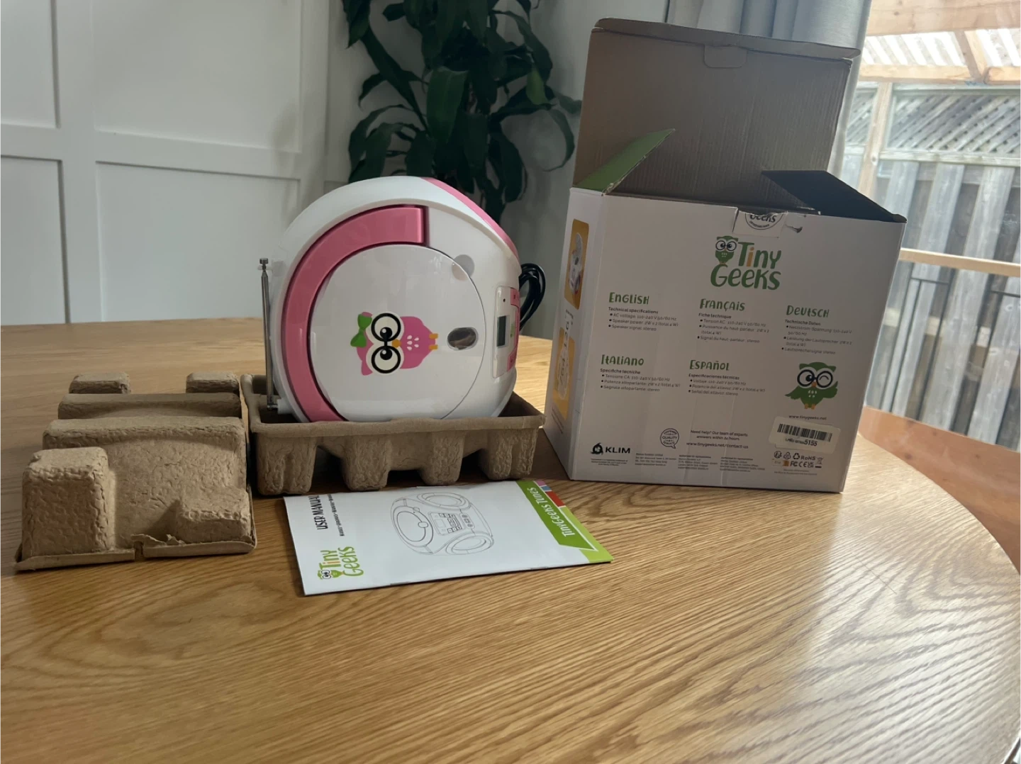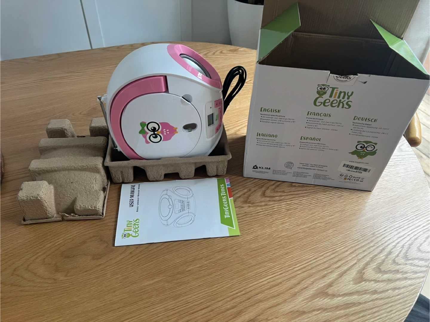 This is a Tiny Geeks CD player boombox in pink and white. It comes with the original box and user manual. It features an AUX input and USB port for versatile playback options.
