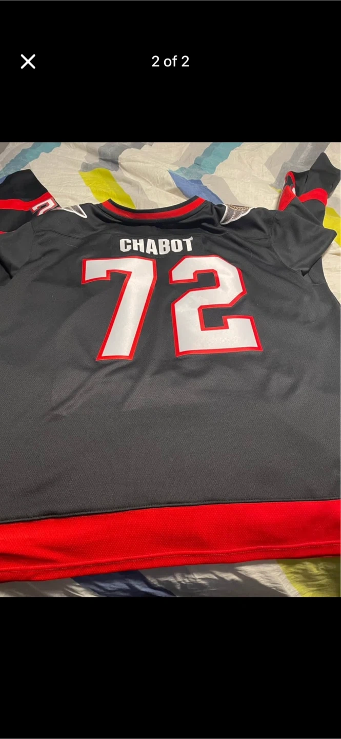 This is an Ottawa Senators hockey jersey with "Chabot 72" on the back. It's black with red and white accents. It's a great jersey for any Senators fan!
