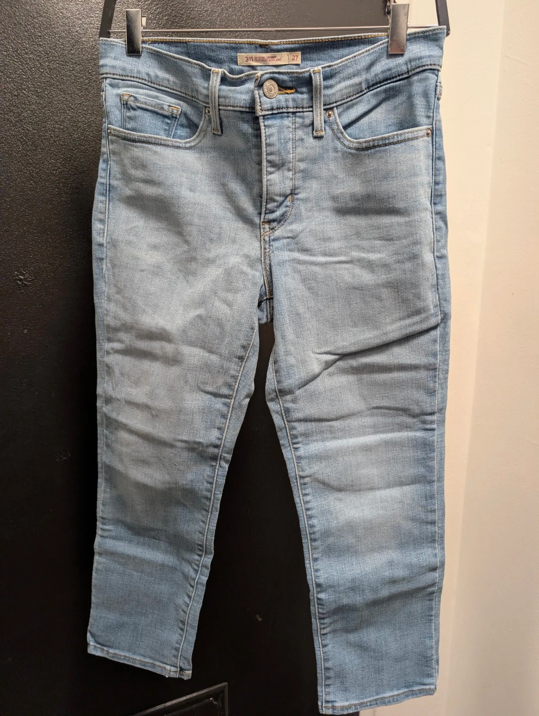Levi's 511 Slim Fit jeans for women. Size 27. Light blue wash denim. These jeans are made from a comfortable cotton blend. They're a classic wardrobe staple!