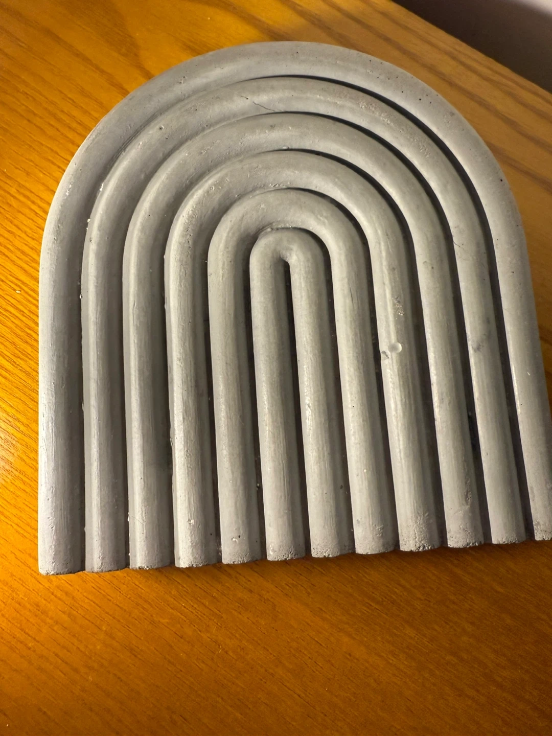 A decorative piece shaped like a rainbow arch. Made of concrete. Sealed for protection.