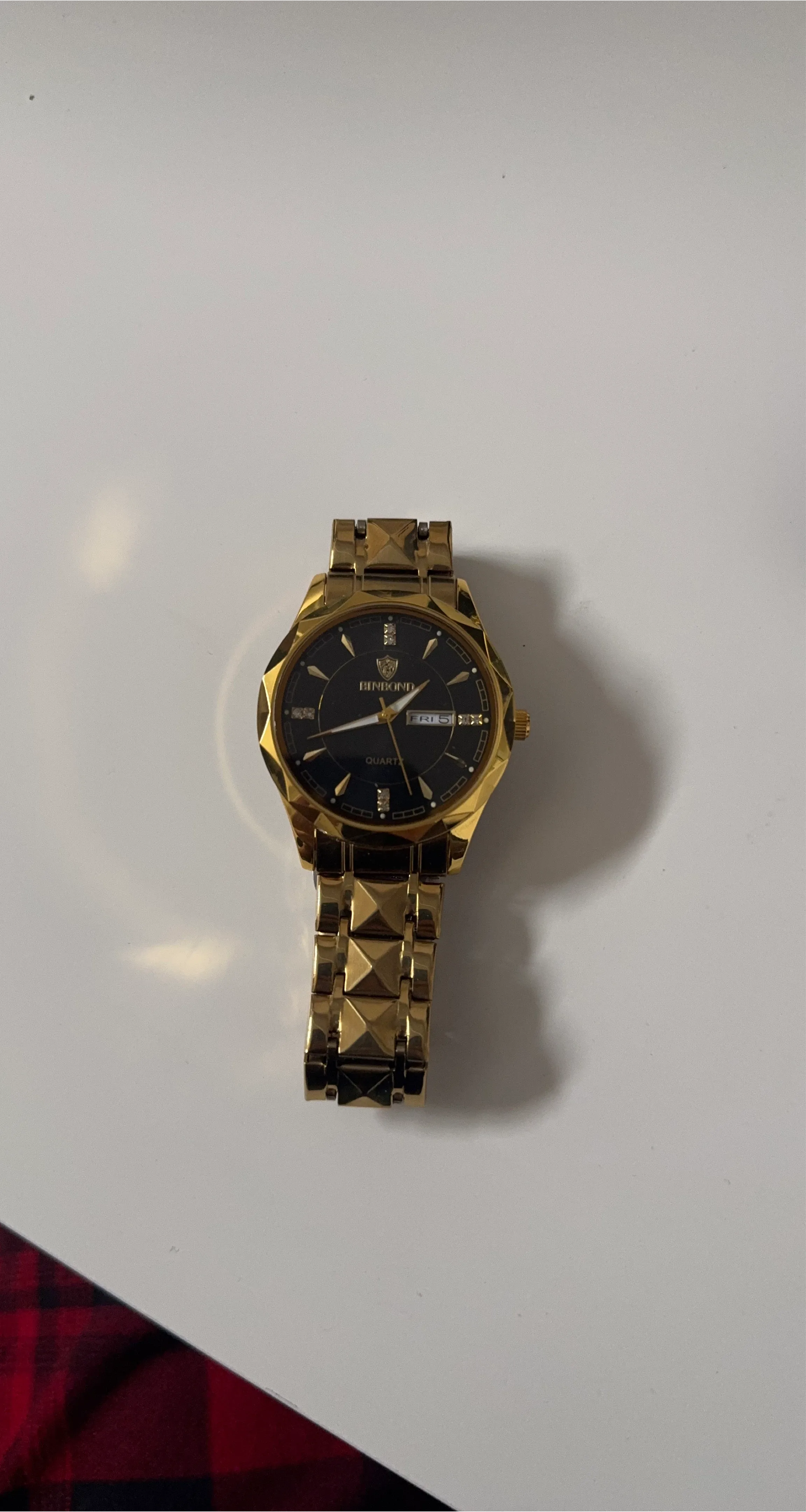This is a BINBOND quartz watch with a gold-tone metal band and black dial. It displays the day and date. It's a stylish accessory for everyday wear.