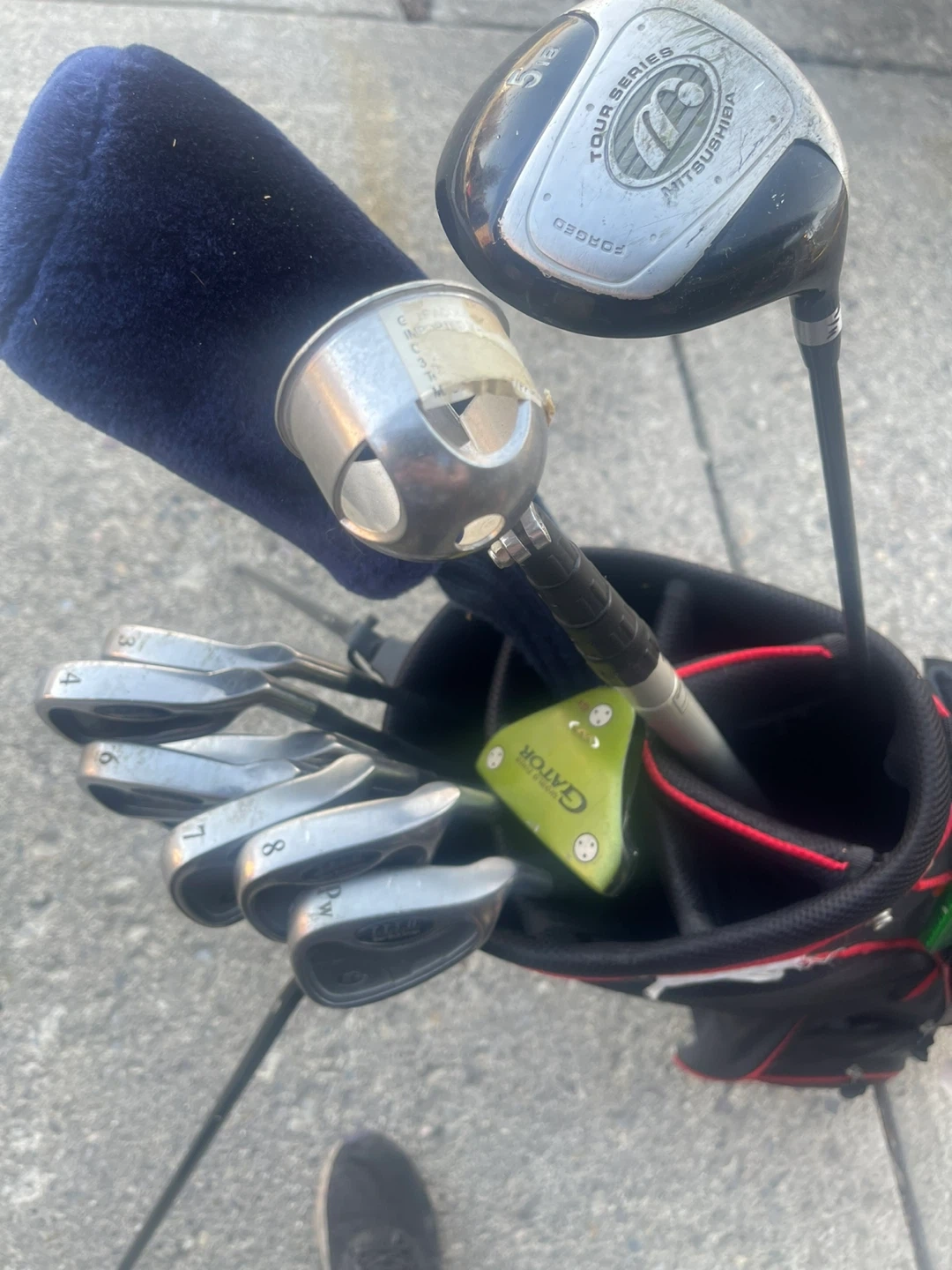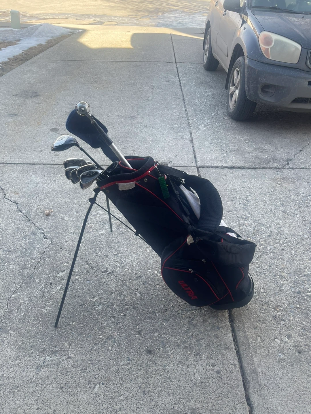Complete golf club set featuring an Ultra golf bag and various clubs, including a 3/5 wood and irons. It's a solid set for anyone looking to hit the links!