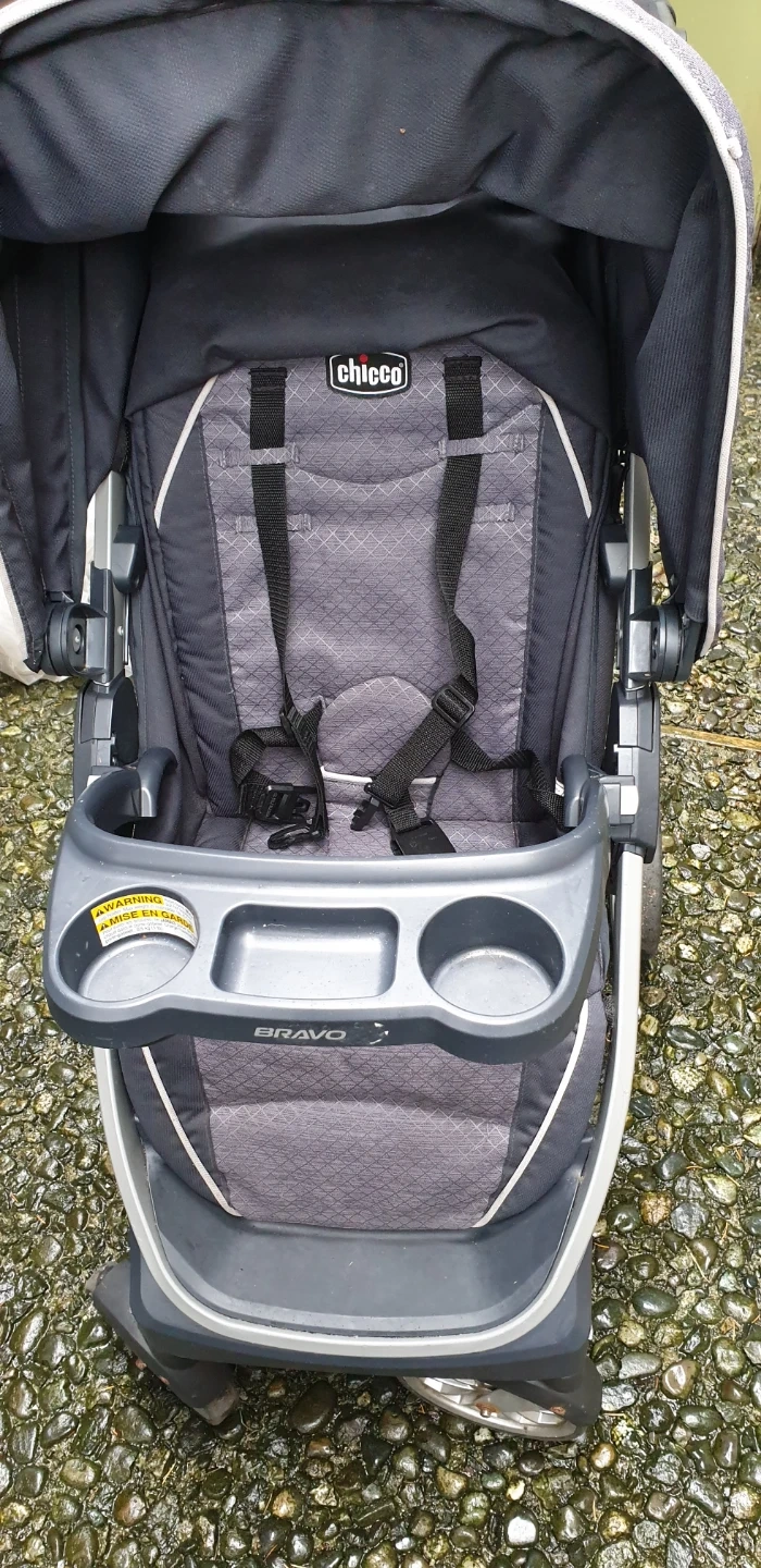 This is a Chicco Bravo stroller. It's grey with black accents and has a detachable tray with cup holders. The stroller's canopy is adjustable for sun protection.