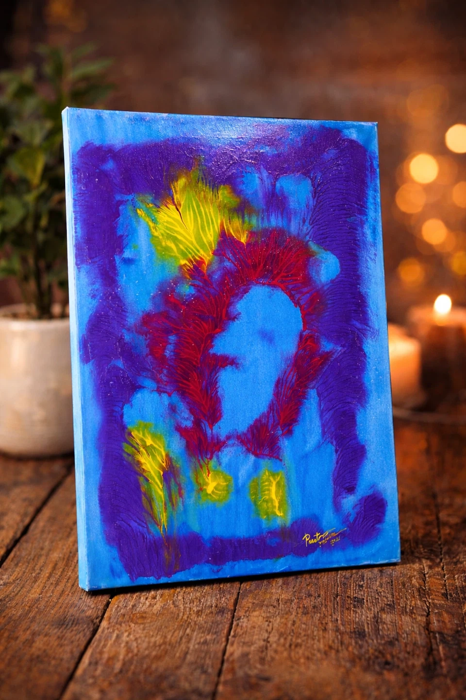 Bold, textured abstract painting by LA-based contemporary artist Preston M. Smith. Hand-signed and dated, featuring expressive color movement and rich tactile surfaces. This is an abstract painting with blues, purples, yellows, and reds. It's a unique piece that could add a pop of color to any room