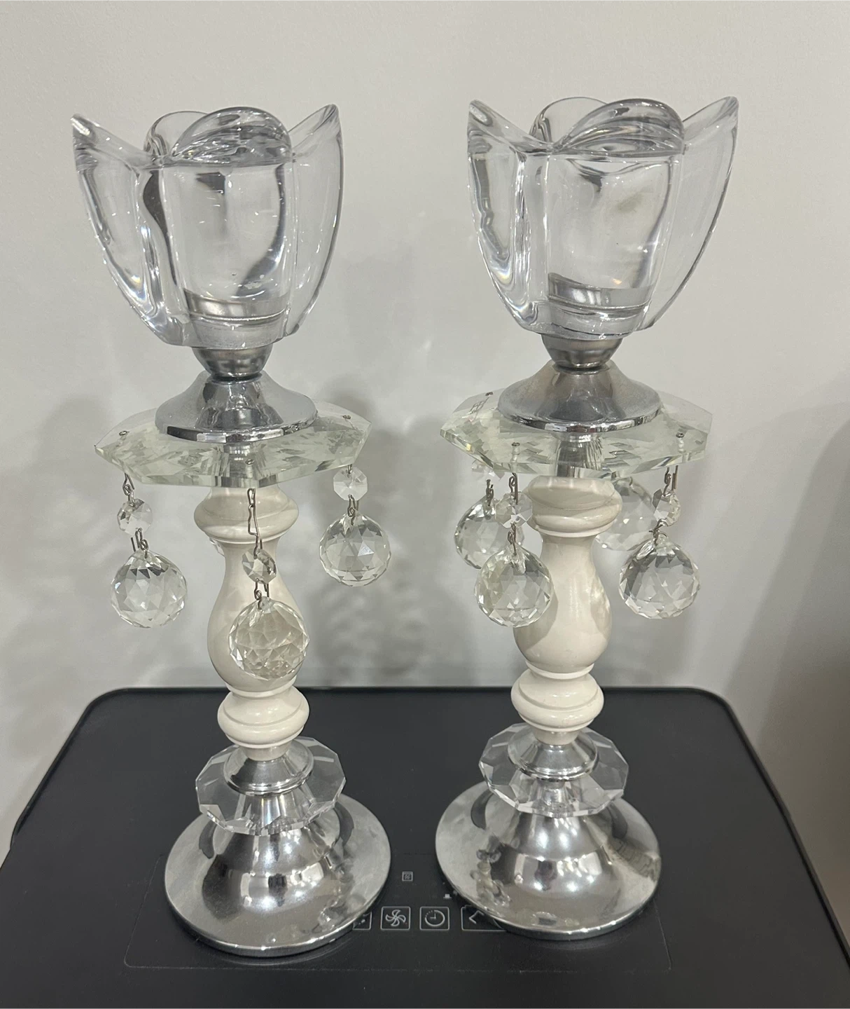 A pair of decorative candle holders featuring clear crystal tops and dangling faux crystals. The stems are a creamy white with silver accents.