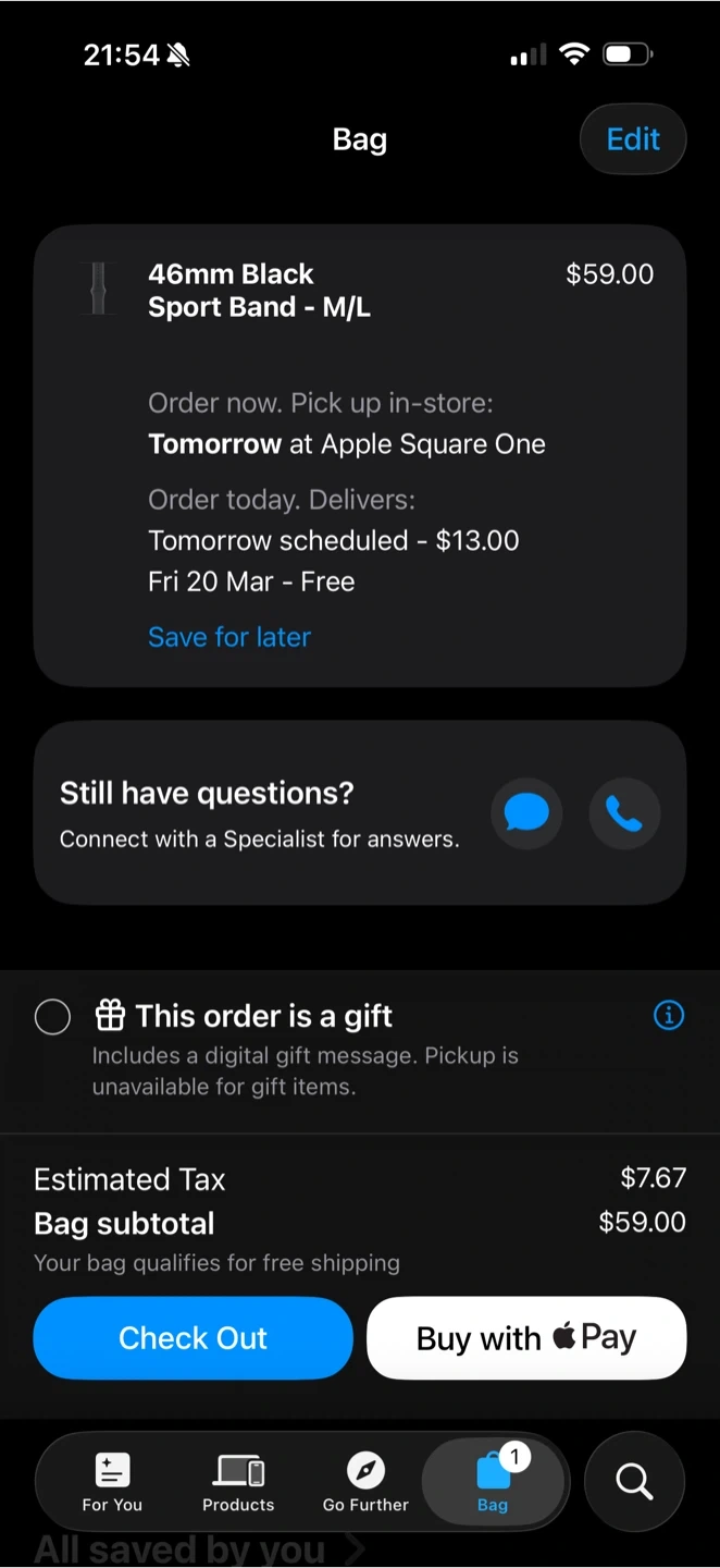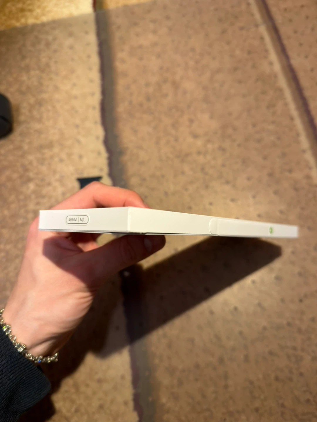 Two Apple Watch bands for sale: 45 mm and 46 mm. One is brand new and still in the box; the other has been used for six months. $30 for the 46 mm band; $20 for the 45 mm band.