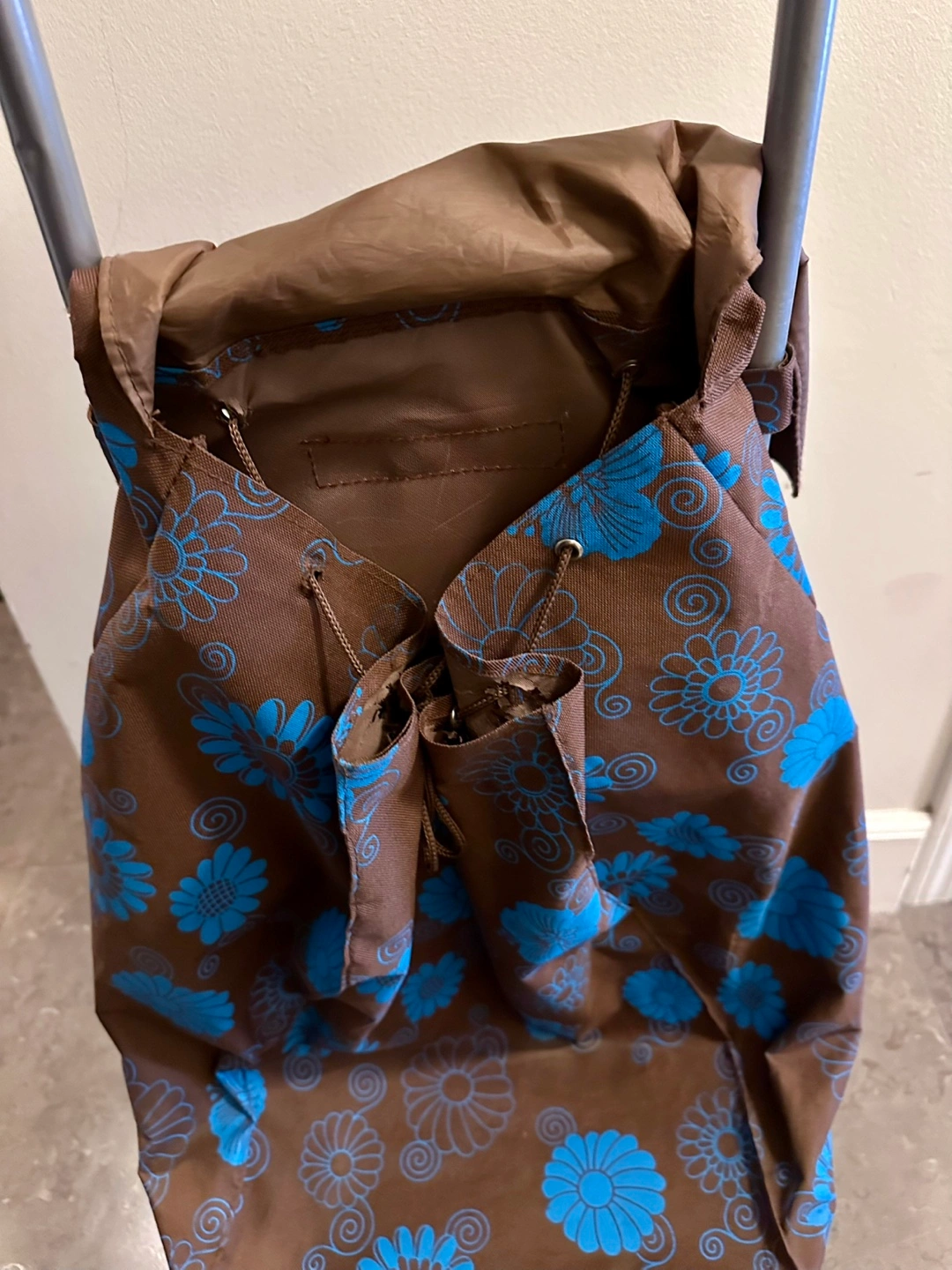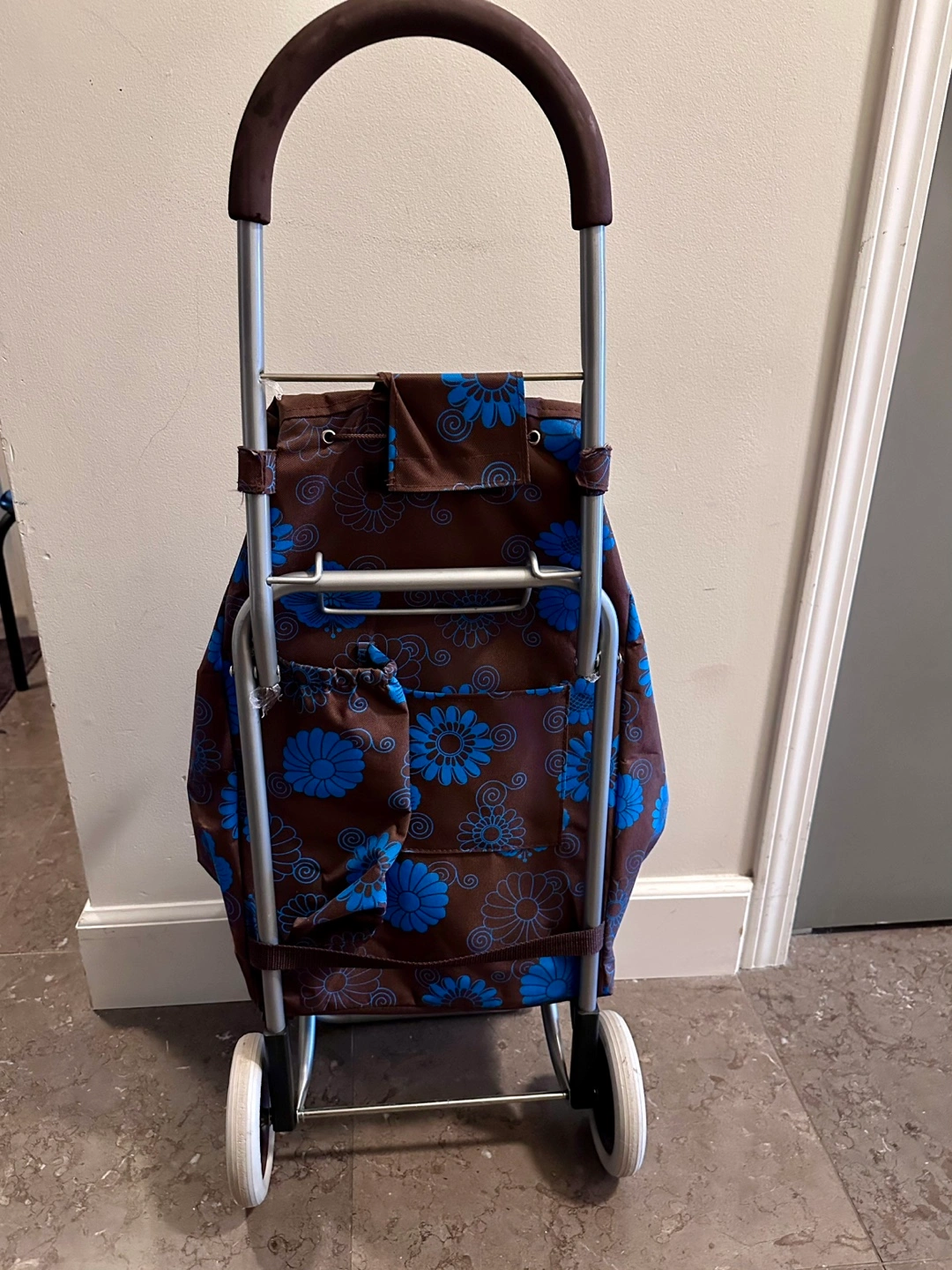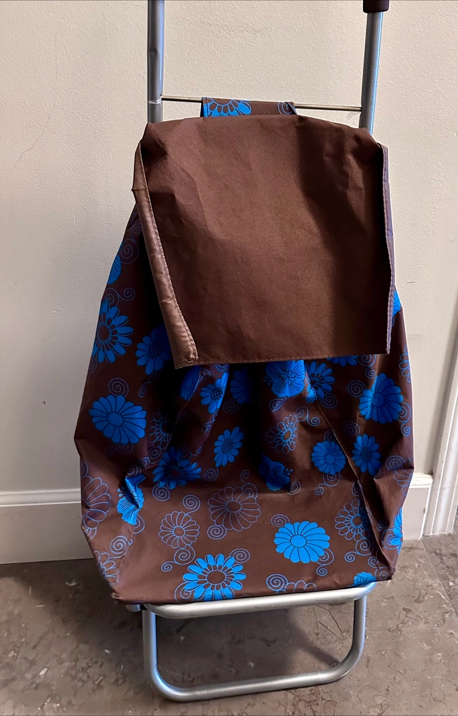 Brown and blue floral design shopping cart. Includes multiple pockets in the back. Lightweight and easy to maneuver.