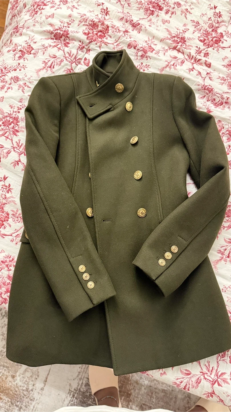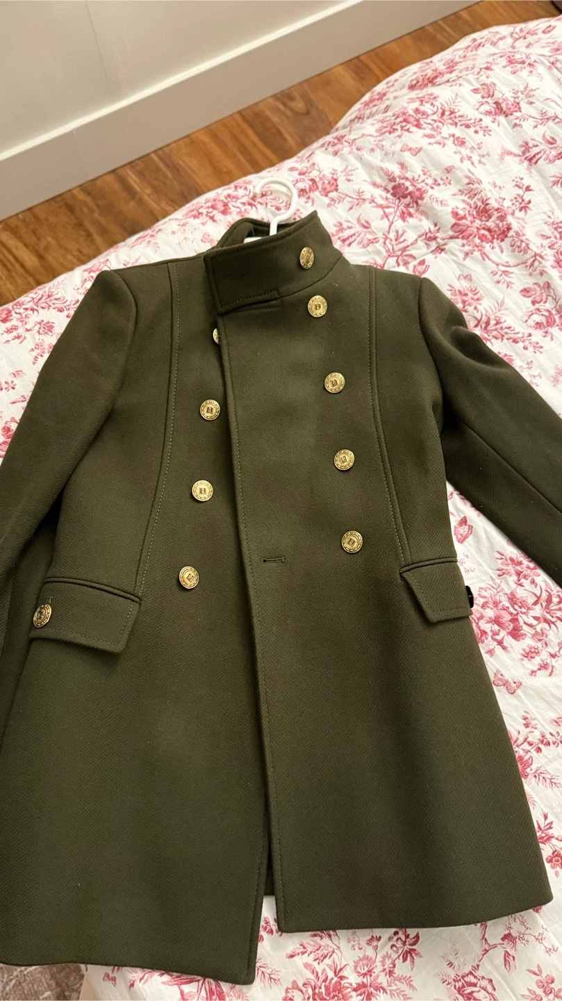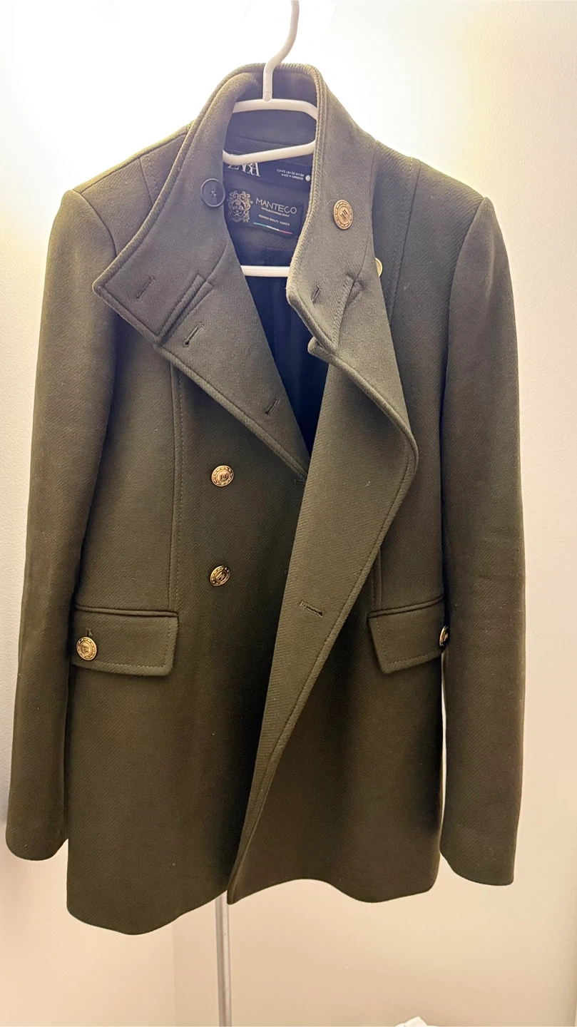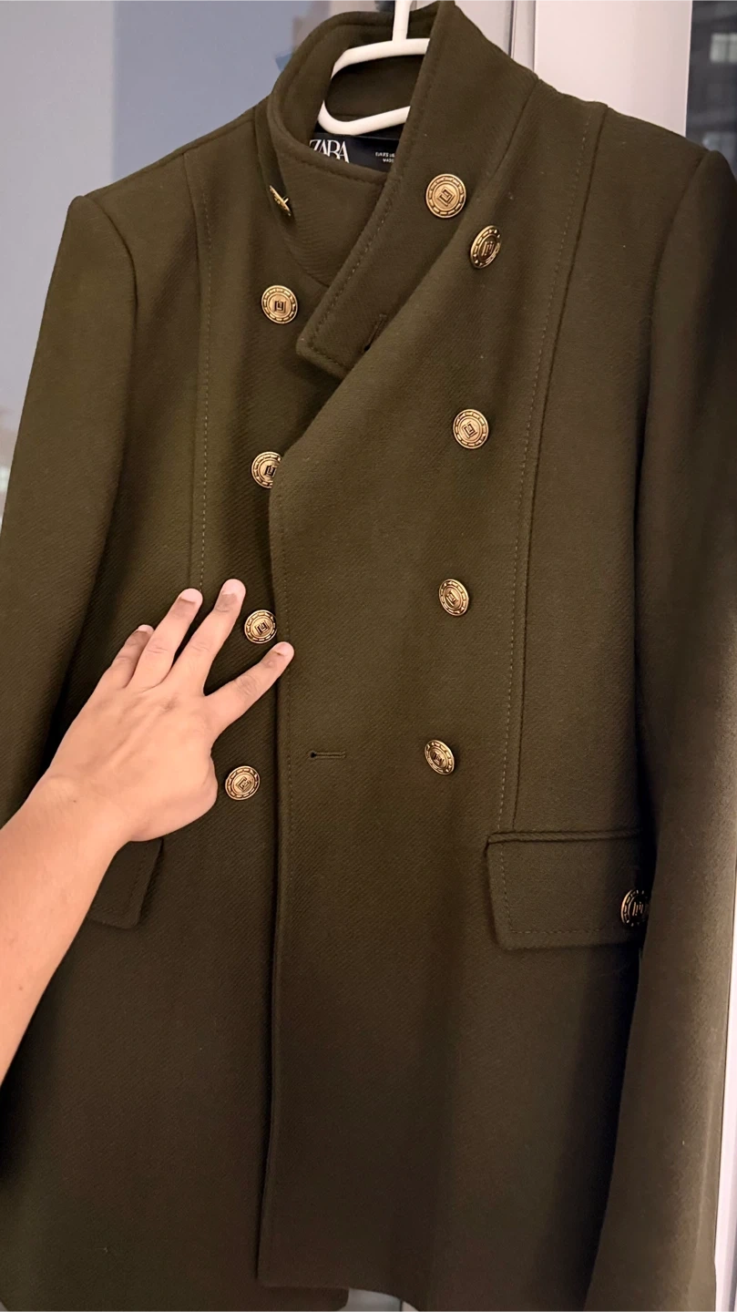 A stylish Zara double-breasted coat in a deep olive green colour. It's designed with a military-inspired aesthetic, featuring gold-tone buttons and a structured collar. This coat is perfect for cooler weather, offering both warmth and a fashionable statement. Material feels like a wool blend.