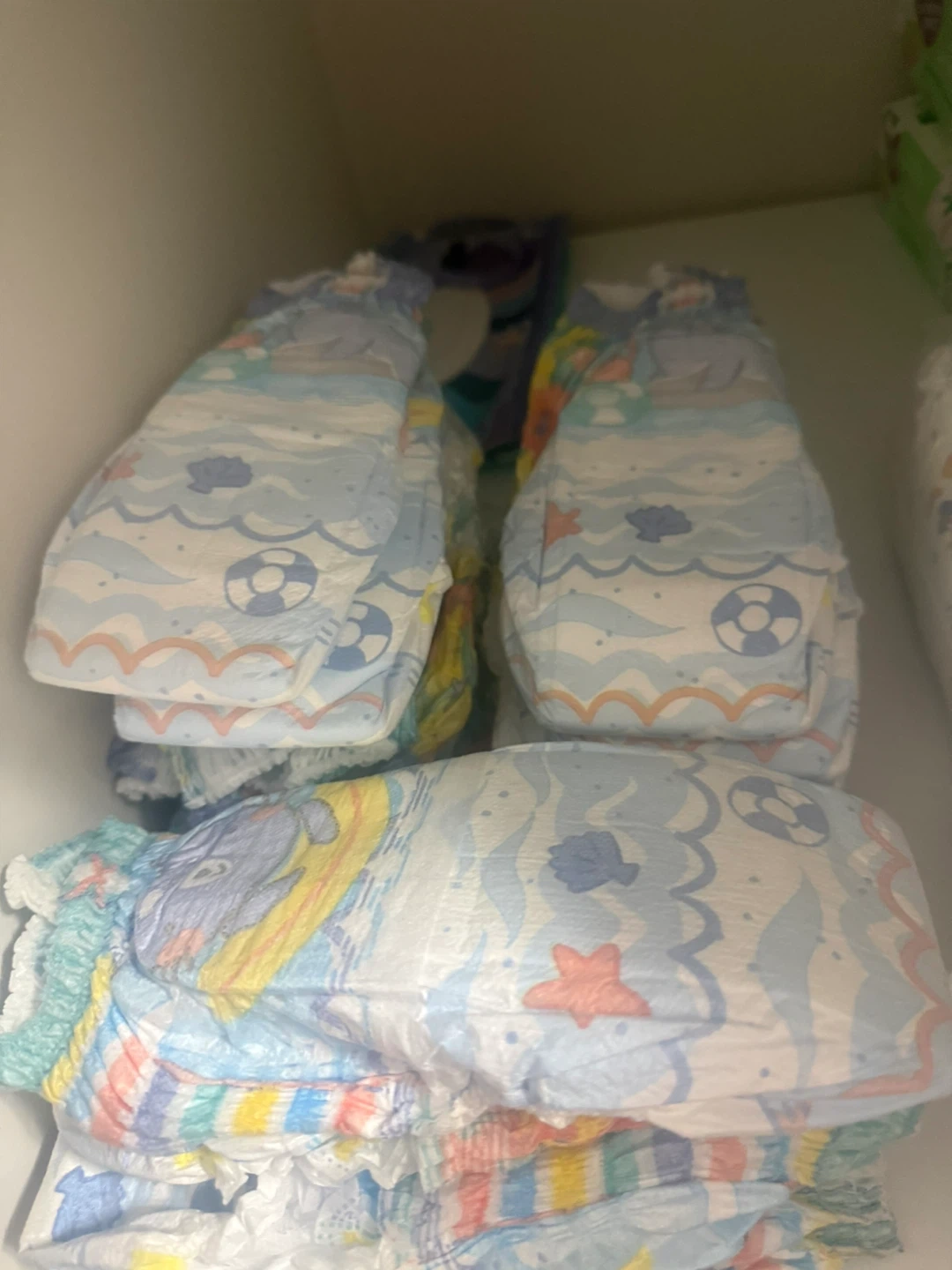 Selling a stack of swim diapers . They are size 6 month and up and feature a fun ocean-themed design with waves, starfish, and sea creatures