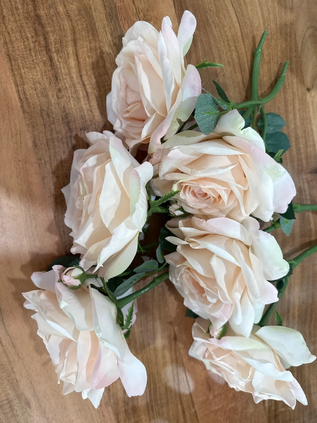 These are artificial rose stems in a lovely pale peach colour. They have fabric petals and plastic leaves and stems. They're about 18 inches long. Good for home decor!