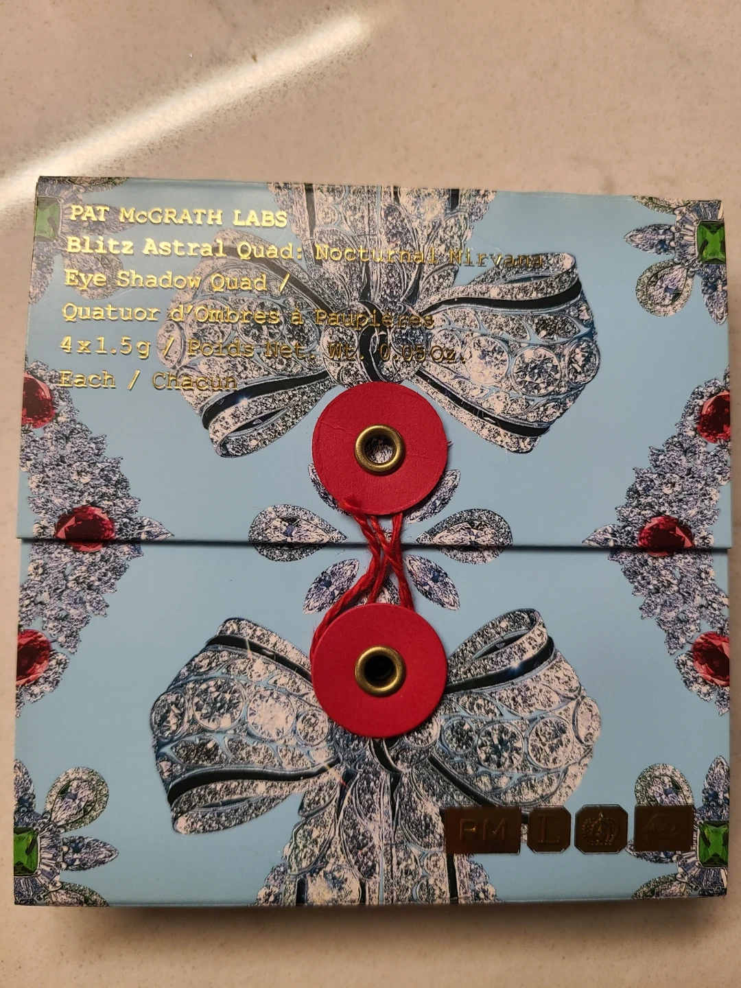 Pat McGrath Labs BLITZ ASTRAL QUAD NOCTURNAL NIRVANA eyeshadow palette. It has four shimmery shades. The colours are highly pigmented and blendable.