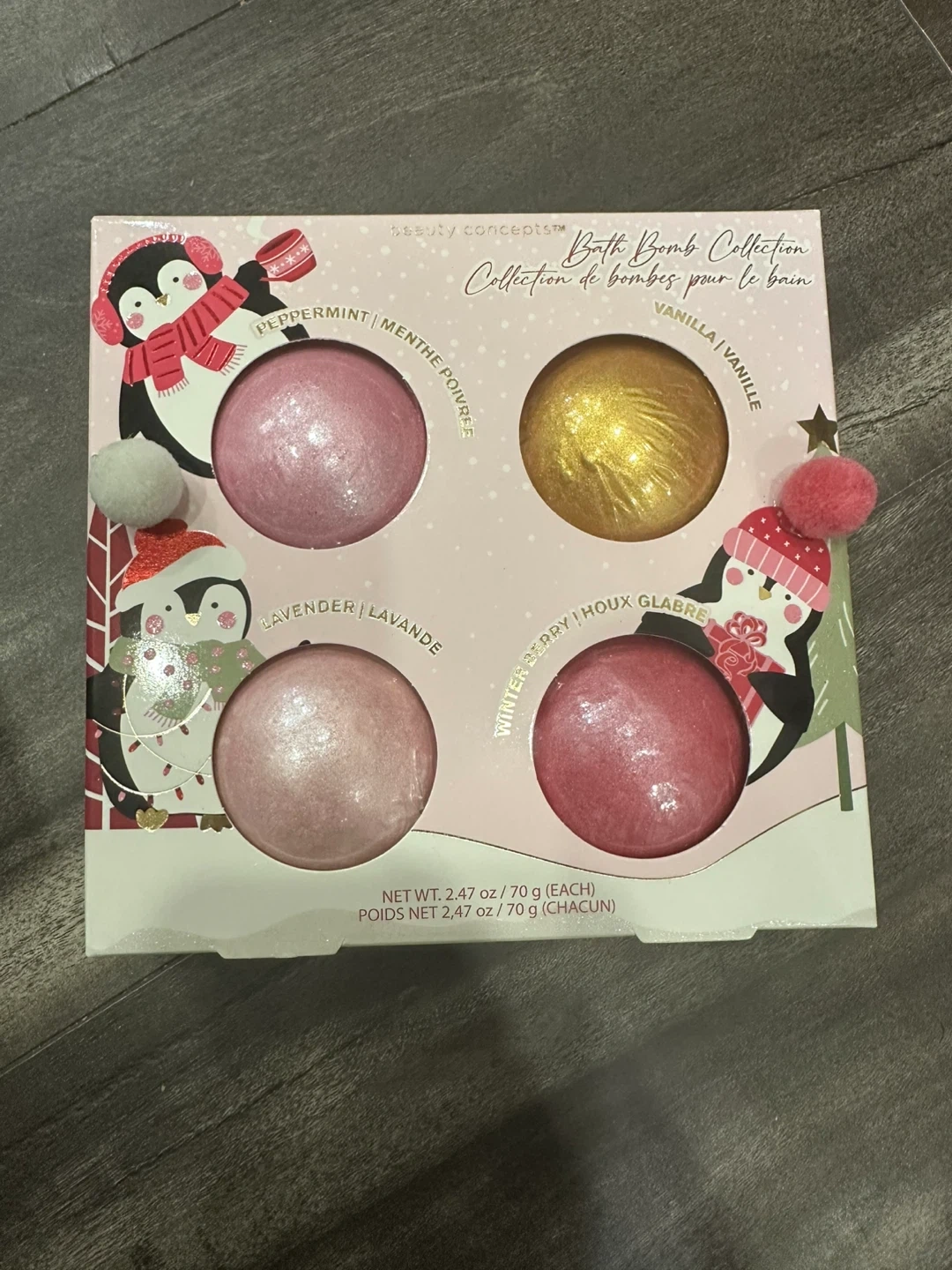A bath bomb collection featuring four scents: Peppermint, Vanilla, Lavender, and Winter Berry. Each bomb is 70g. These are great for a relaxing soak!