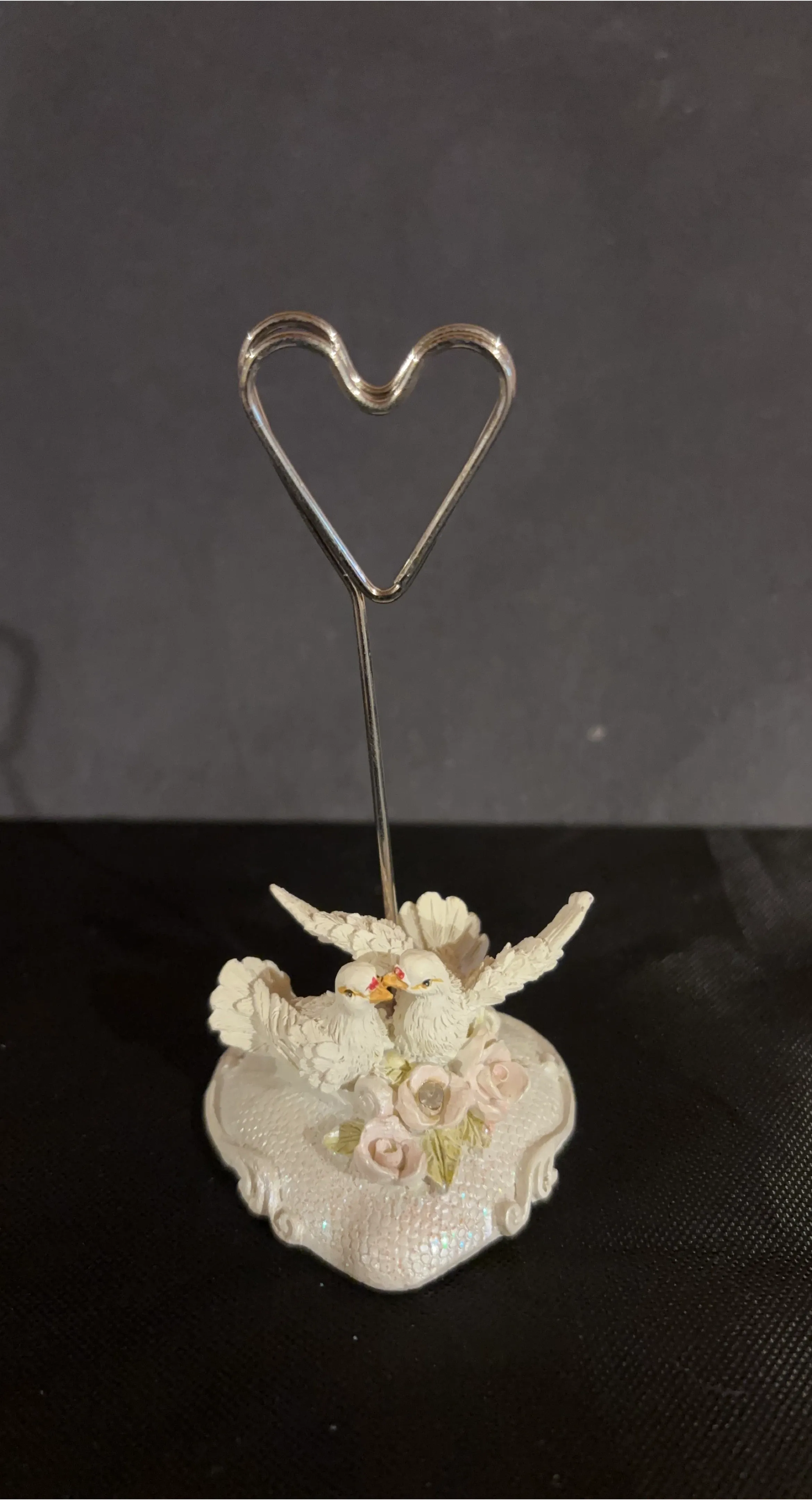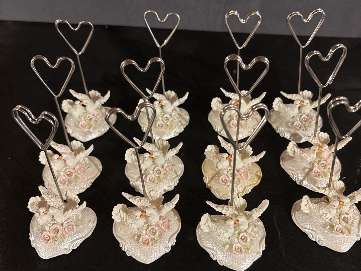 This set includes twelve place card holders, each featuring two white love birds perched on a heart-shaped base adorned with roses. It's perfect for weddings or special events. Each holder has a heart-shaped clip to display place cards or photos. 4H x 2W