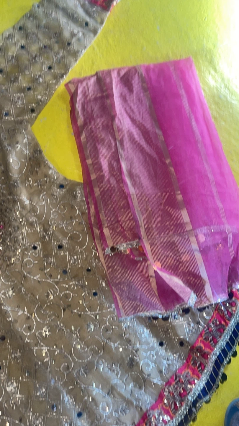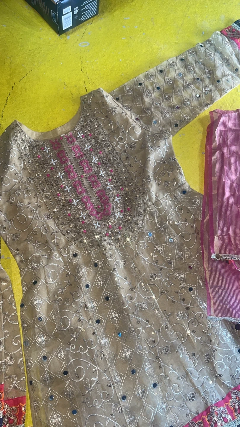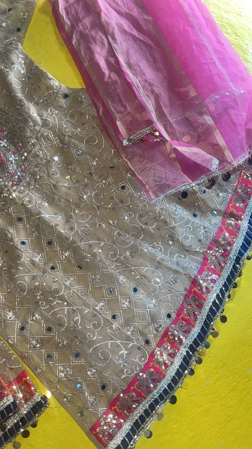 This is a beautiful embellished kurti with a matching dupatta for kids. The kurti features intricate embroidery, mirror work, and bead detailing. The dupatta is a vibrant pink with striped accents and a decorative border. Perfect for special occasions!
