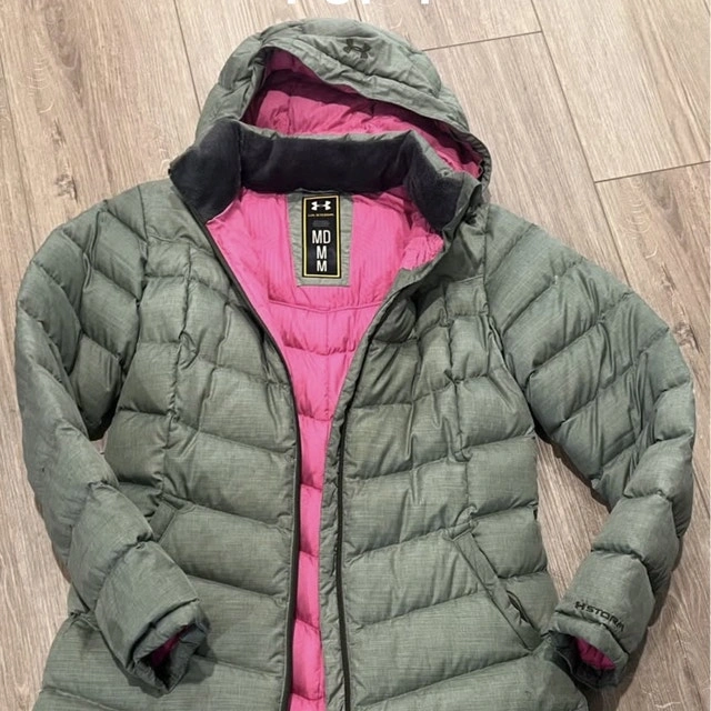 Used Under Armour jacket, perfect for cooler weather. It features a full zip front and a hood. Size Medium. Green exterior with pink interior. Puffer style. If the ad is up, the jacket is available.