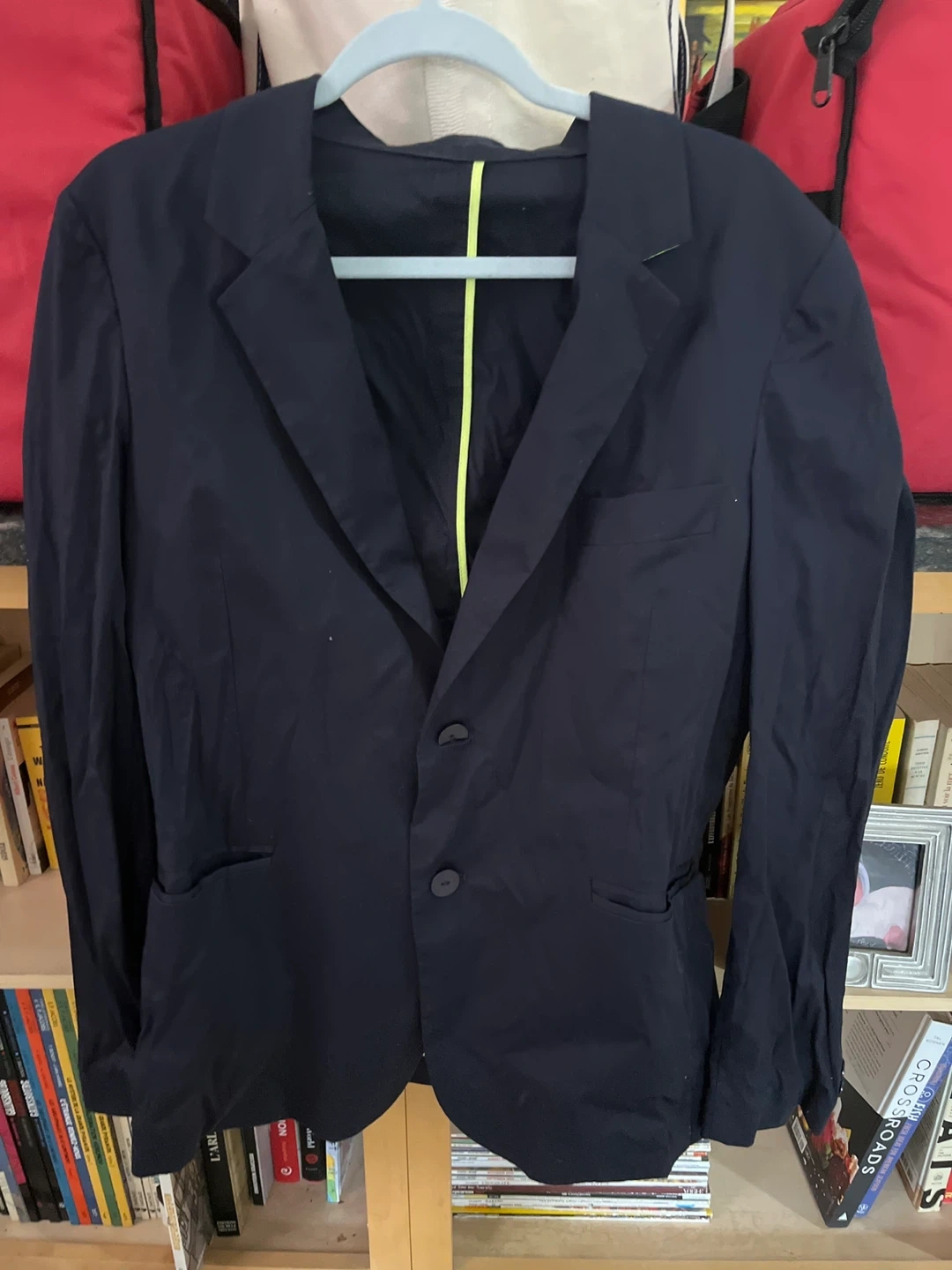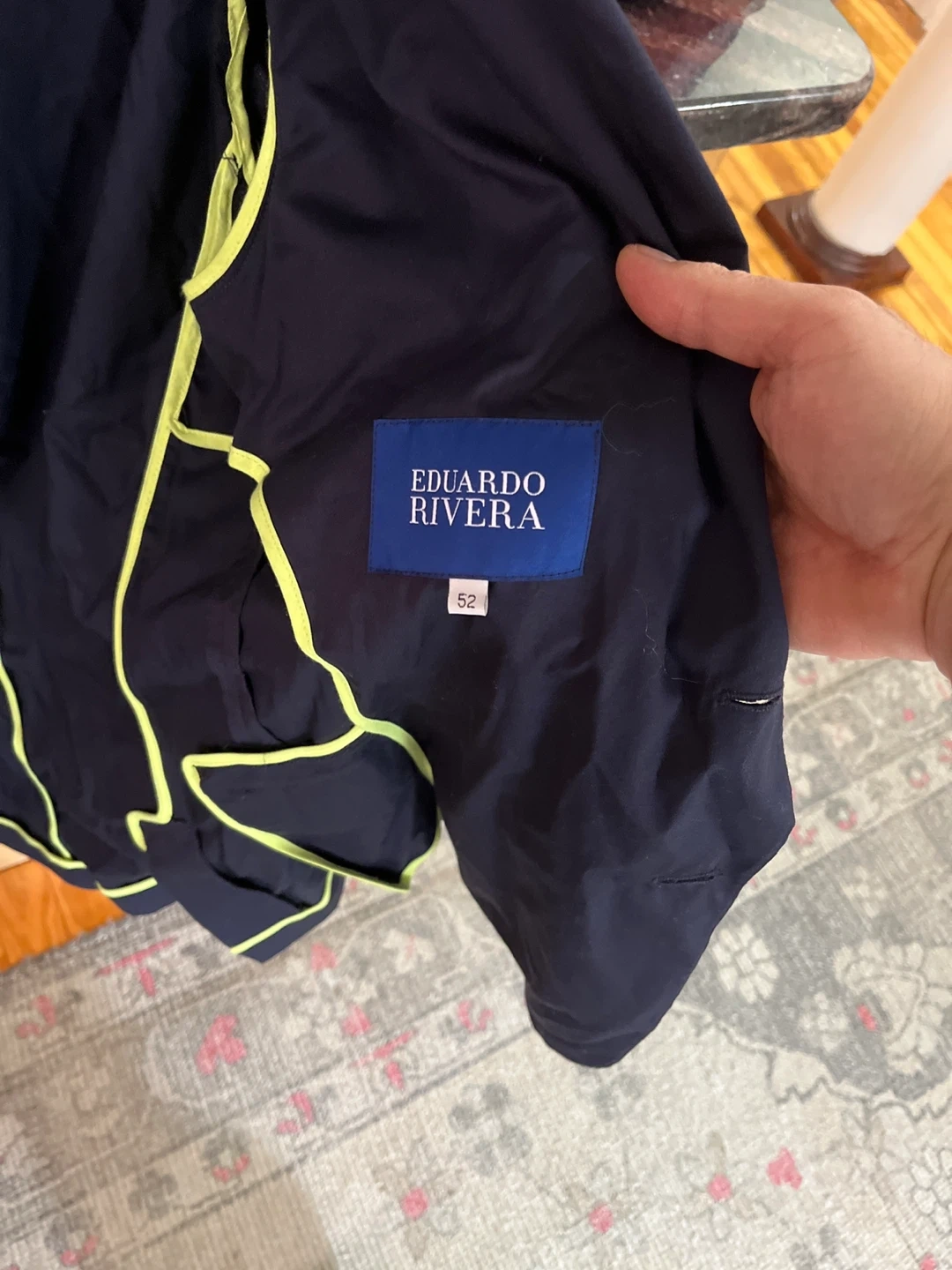 This navy blazer is from Eduardo Rivera and is a size 52. It features a bright neon yellow lining. It's a classic blazer style with two buttons in the front.