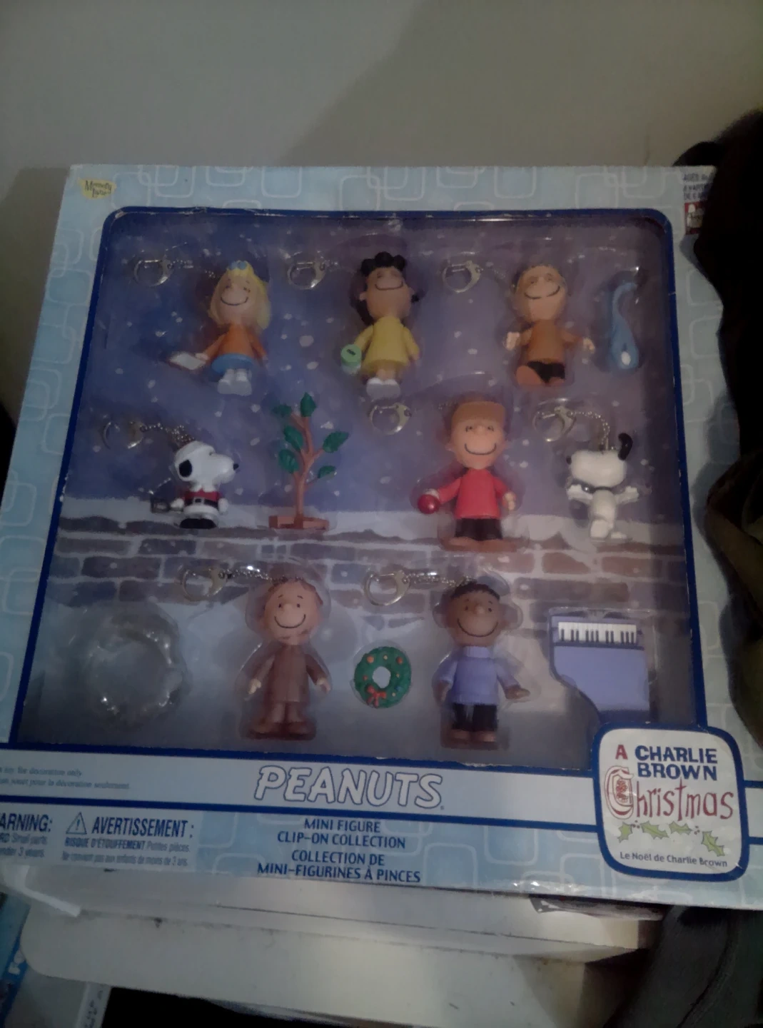 This set features mini clip-on figures from A Charlie Brown Christmas. Includes various characters like Charlie Brown, Snoopy, and Lucy. Some accessories like a Christmas wreath and a piano are also included.