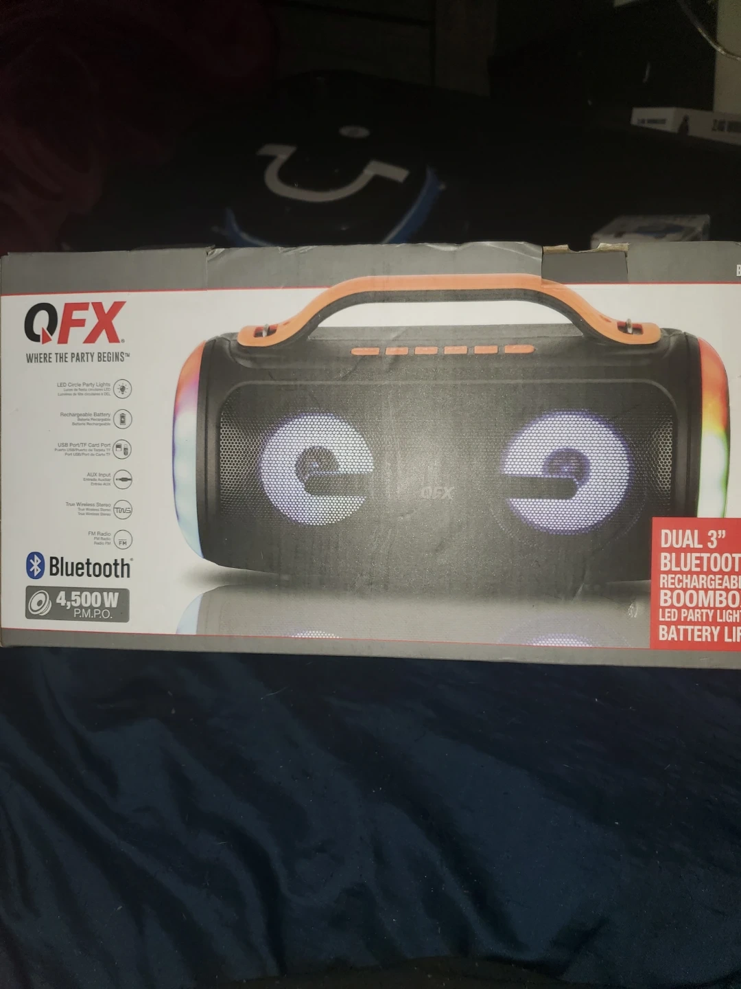 This QFX boombox features dual 3" speakers and LED party lights. It's rechargeable and has a USB/TF card port and FM radio. It offers True Wireless Stereo and 4,500W P.M.P.O. power.