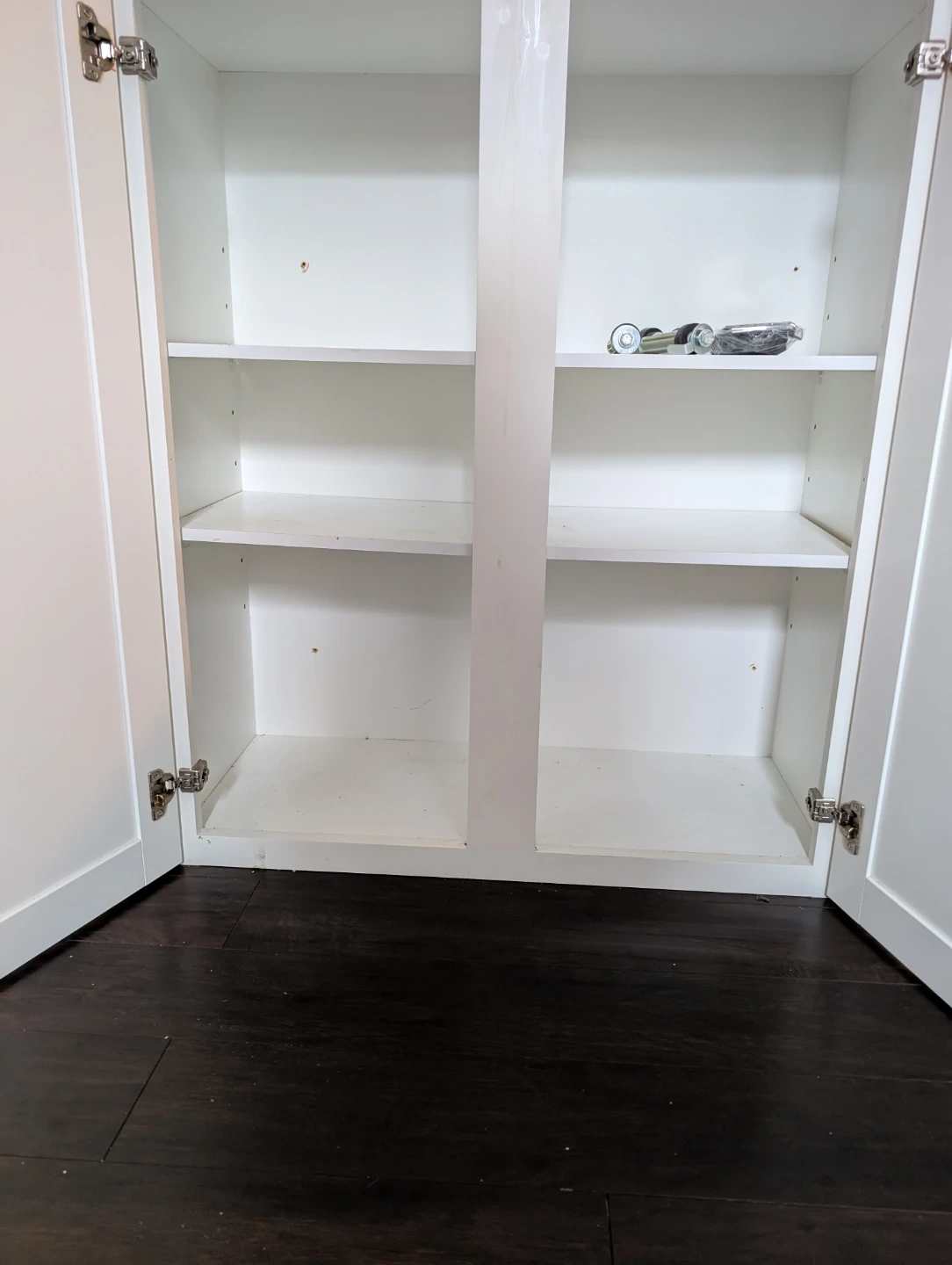 This white cabinet has two doors and adjustable shelves inside. It's great for storing linens or kitchen essentials. The doors have standard hinges.