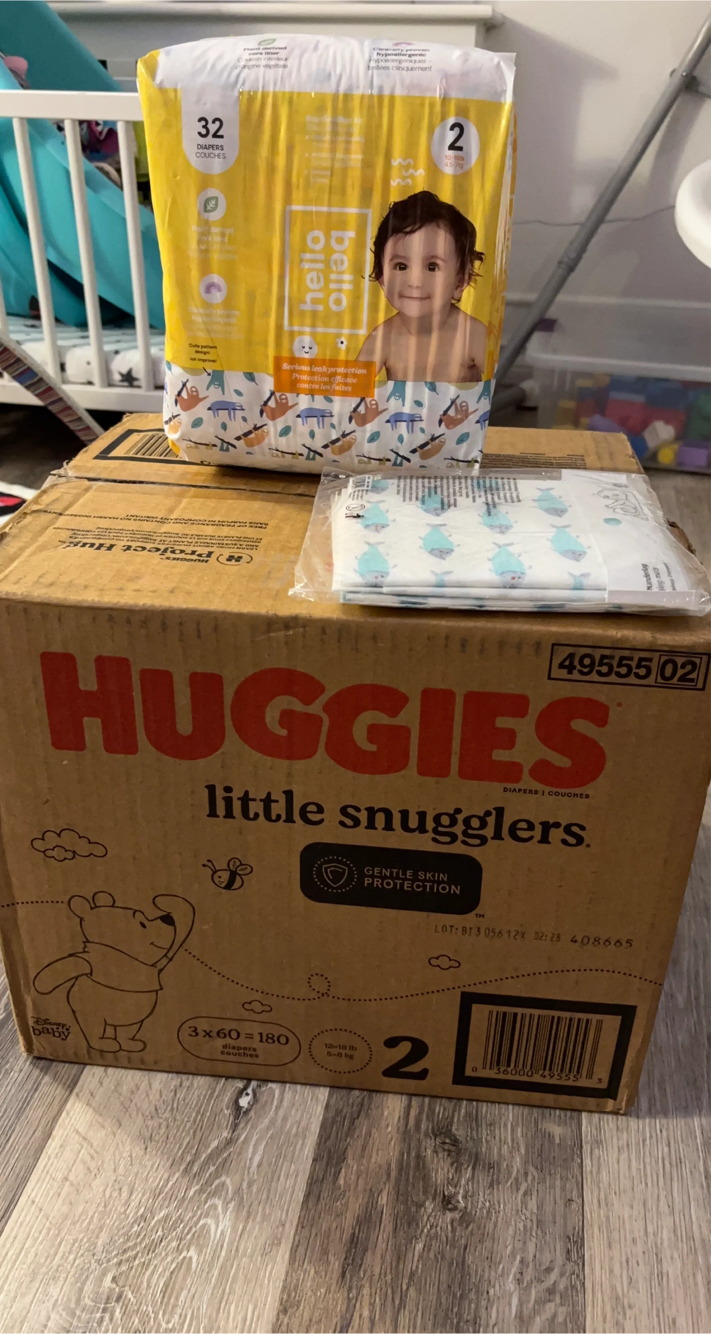 Brand new Huggies Little Snugglers diapers. Size 2, for babies 12-18 lbs. Box contains 3 packs of 60 diapers for a total of 180 diapers. Gentle Skin Protection.
