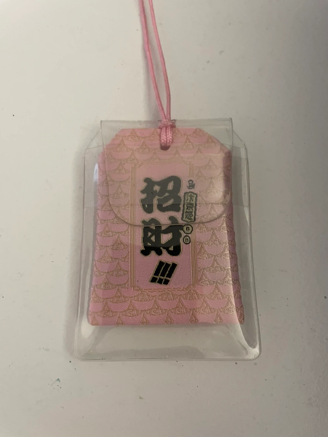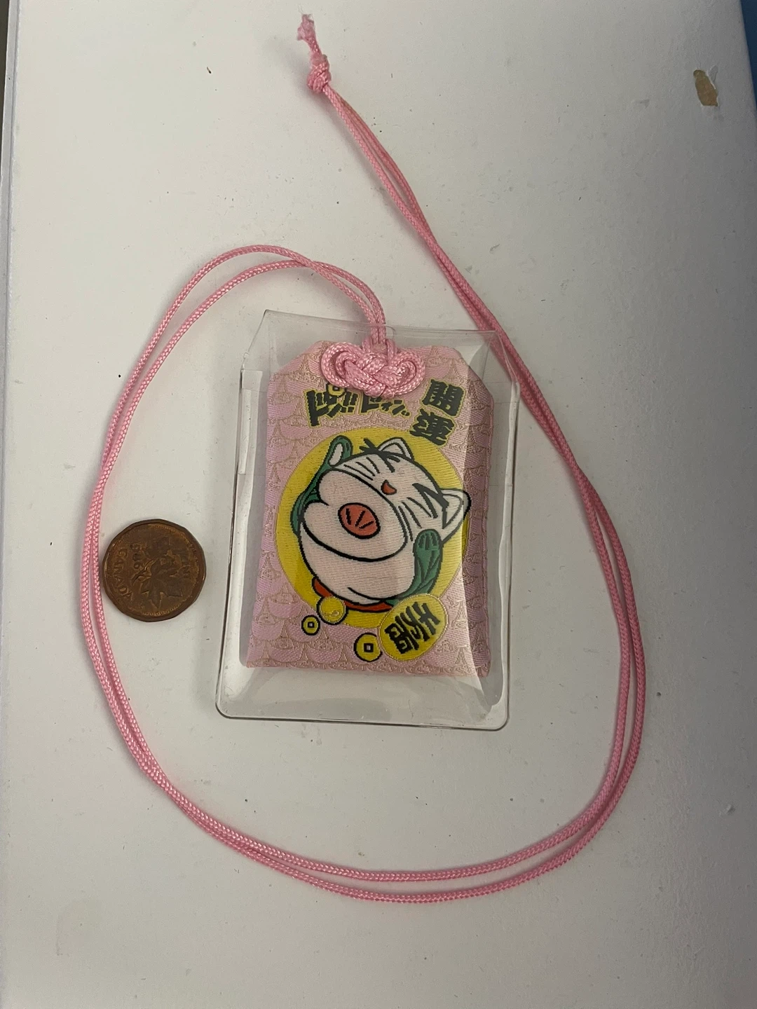 This is a pink lucky cat charm with traditional Japanese calligraphy. It features a cute cartoon cat on one side. It comes with a pink cord for hanging. Perfect for adding a touch of luck and charm to your day!