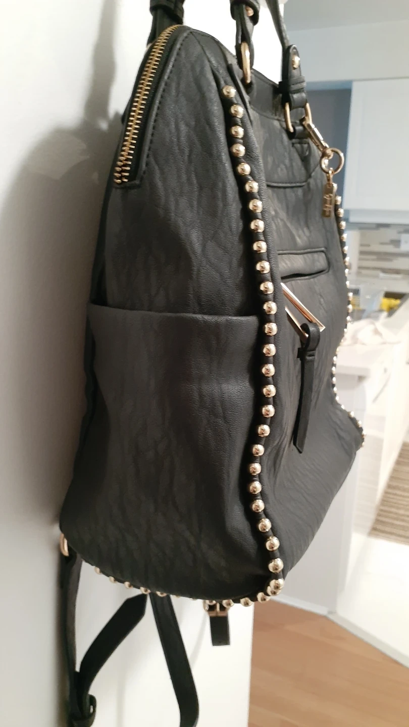 This black Jessica Simpson backpack is made of black faux leather. It features a studded design along the front and sides, with gold-tone hardware. Includes top handles and adjustable shoulder straps for versatile carrying. The interior lining has a leopard print.