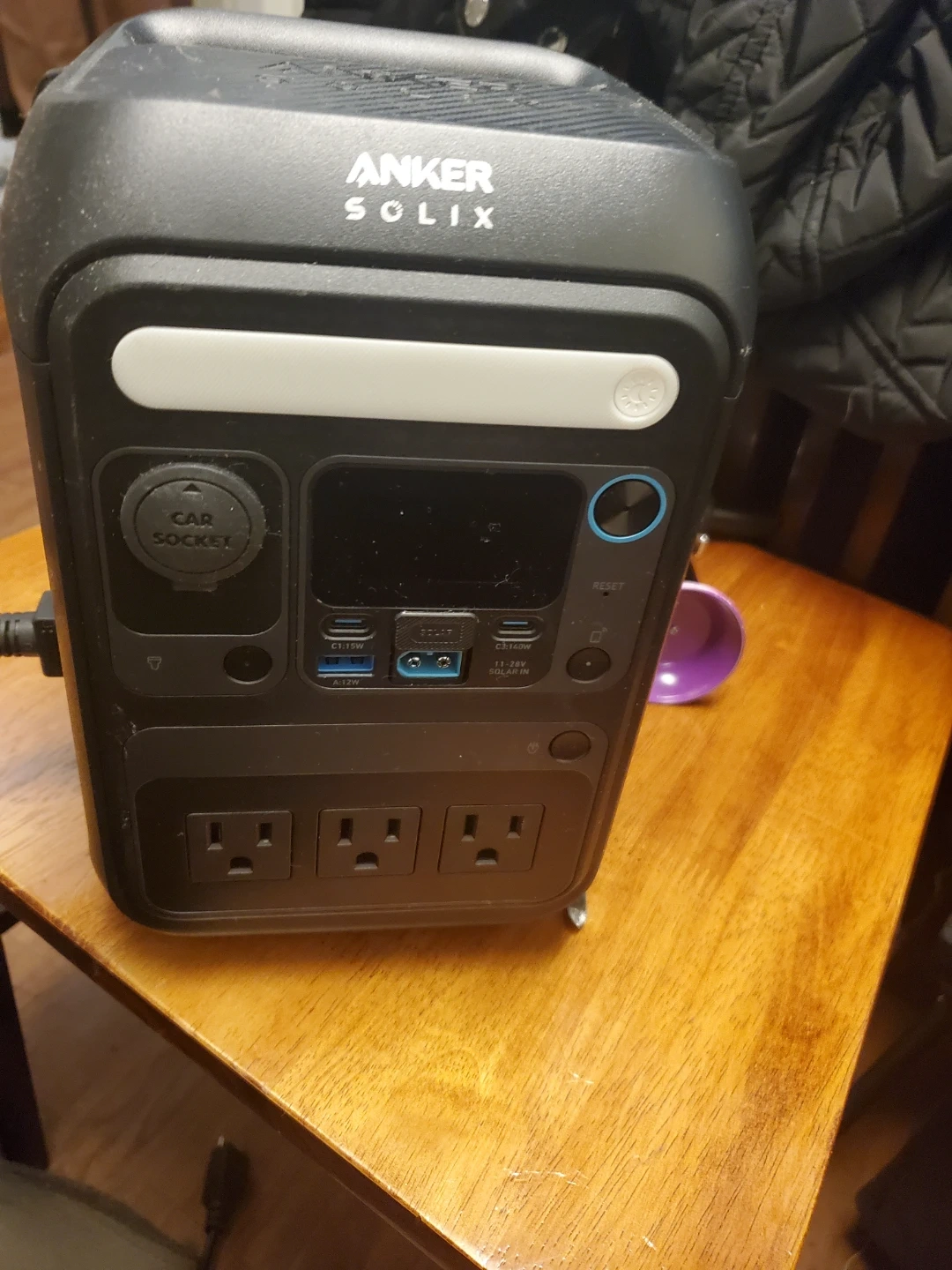 This is an Anker SOLIX portable power station. It features multiple AC outlets, USB-C ports, and a car socket. It also has a solar input for charging.