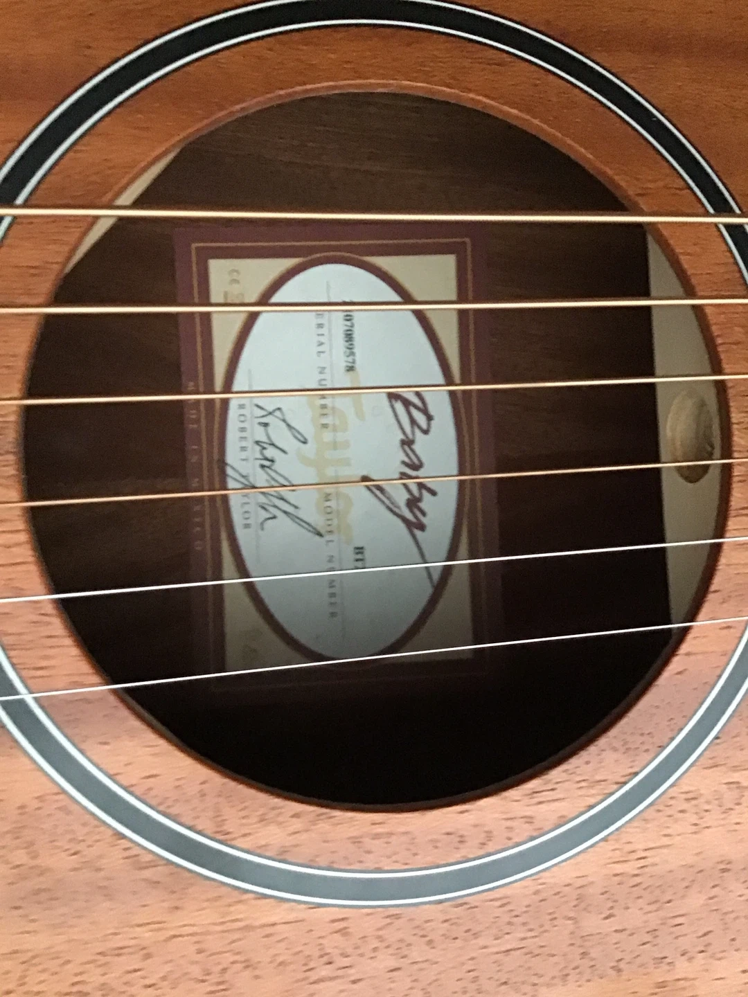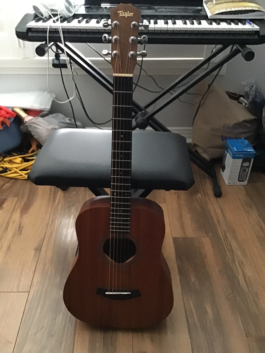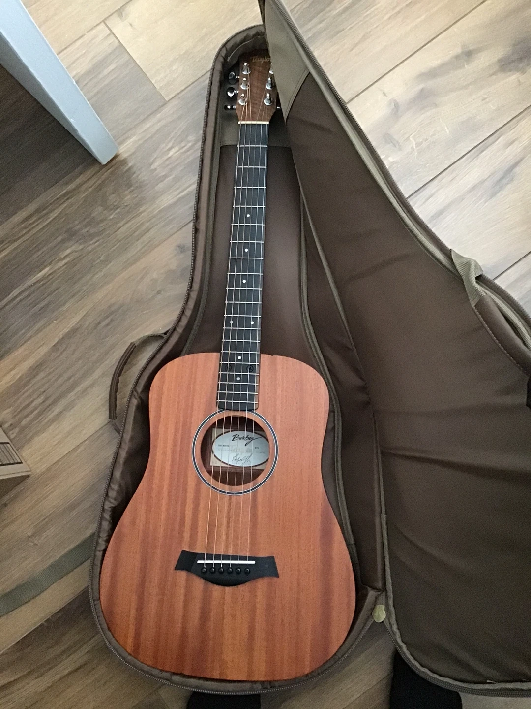 This is a Taylor Baby acoustic guitar. It's a smaller body size, making it comfortable to play. Includes a padded Taylor gig bag for protection and transport.