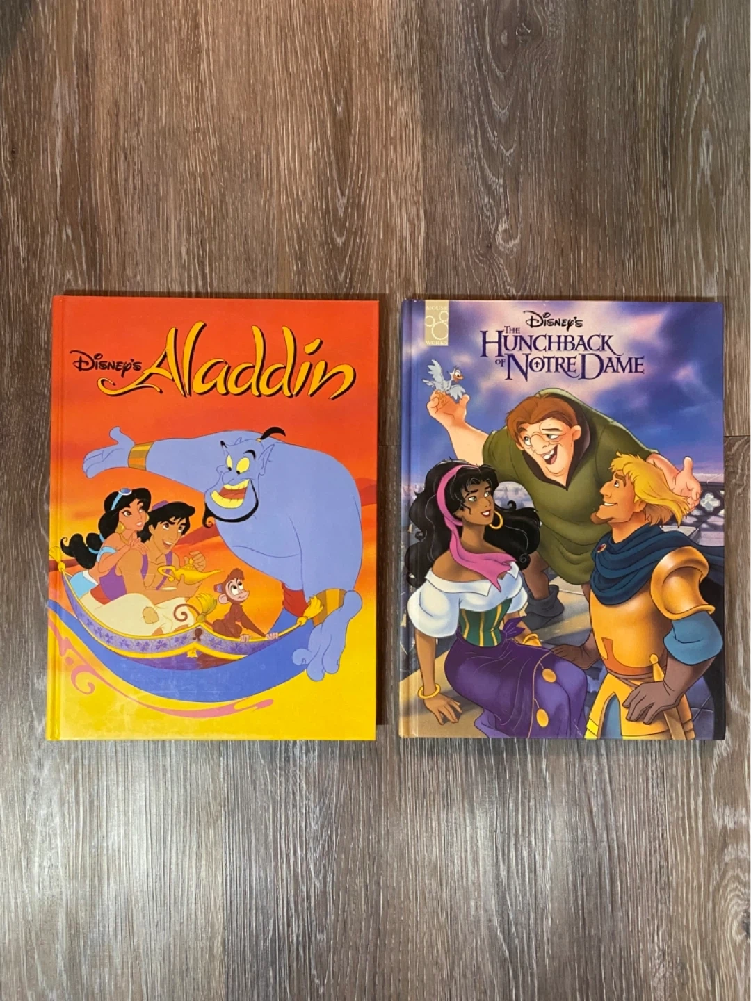 Two classic Disney storybooks featuring Aladdin and The Hunchback of Notre Dame. These colourful books are perfect for young Disney fans. They're filled with beloved characters and captivating tales.