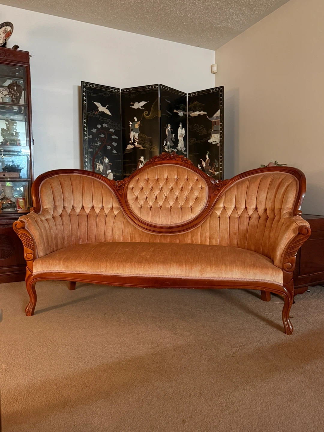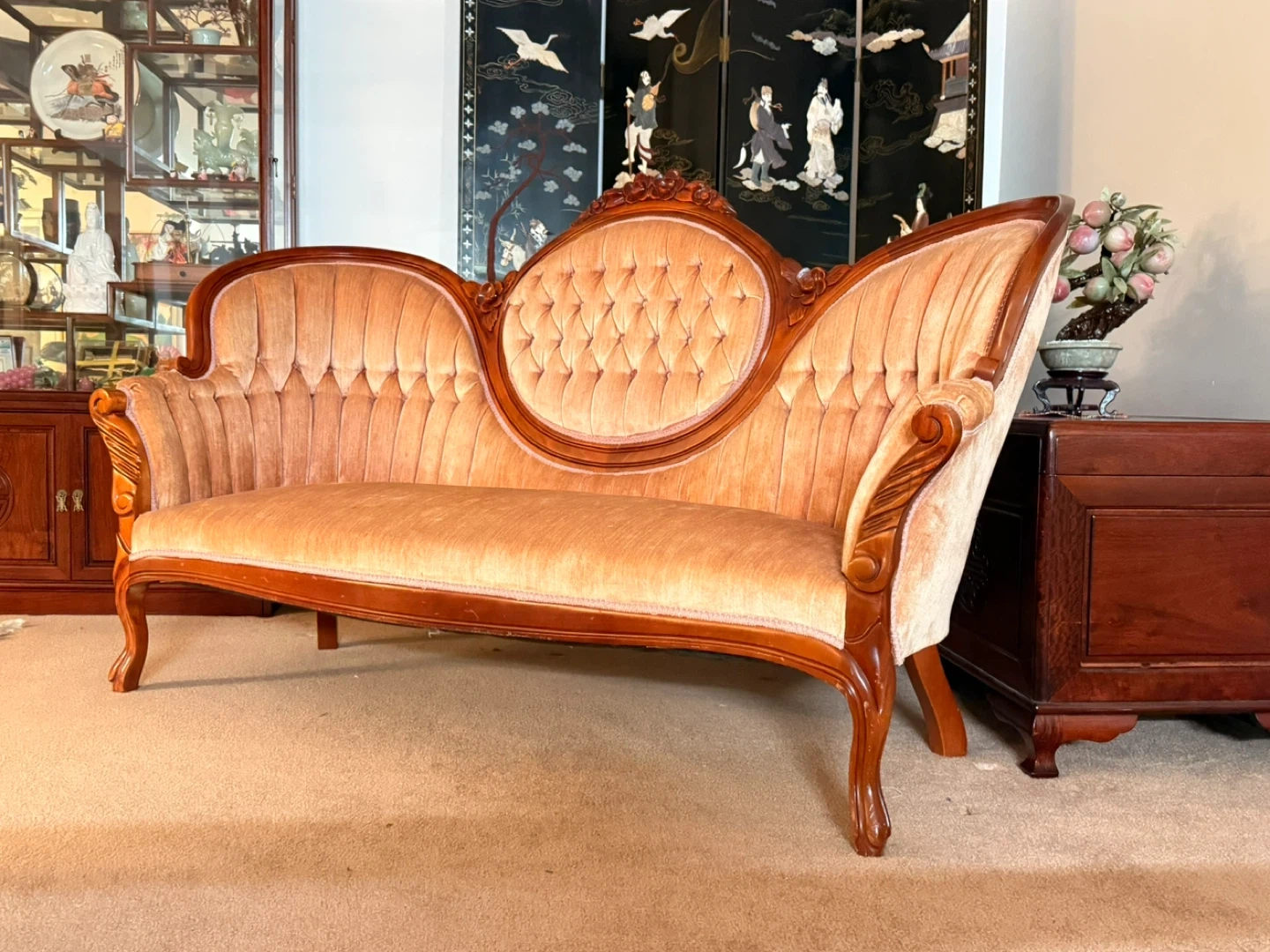 Elegant Victorian revival loveseat sofa. Exceptional vintage quality. Rare, investment-quality piece by Kimball Furniture Reproductions, known for their high-end craftsmanship and historically accurate designs. This piece features a graceful serpentine back, hand-carved solid wood frame, and luxurious tufted velvet upholstery in a warm peach/apricot tone.