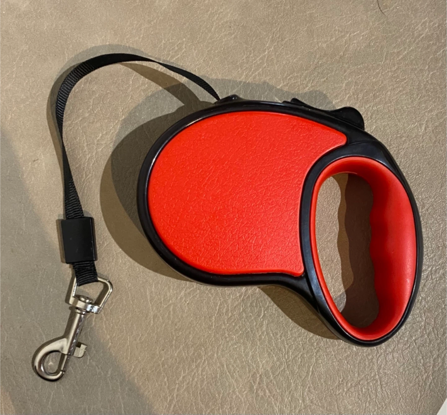Red and black retractable dog leash with a silver metal clip. It's a handy tool for walks and training your dog. The grip is designed for comfort. Great for small to medium-sized dogs!