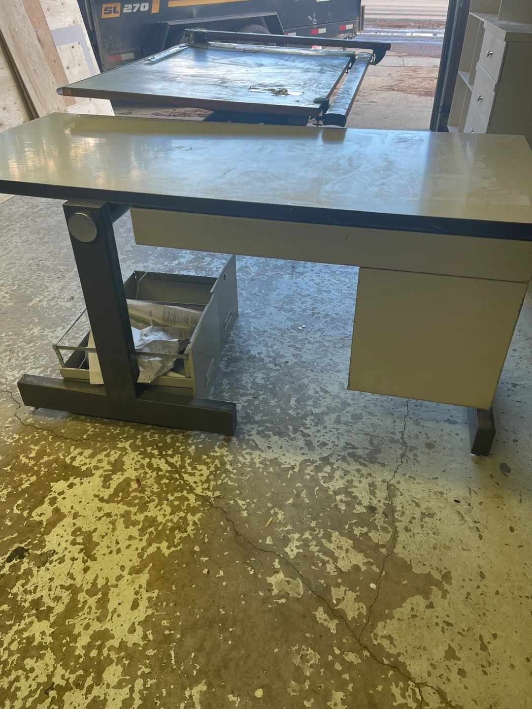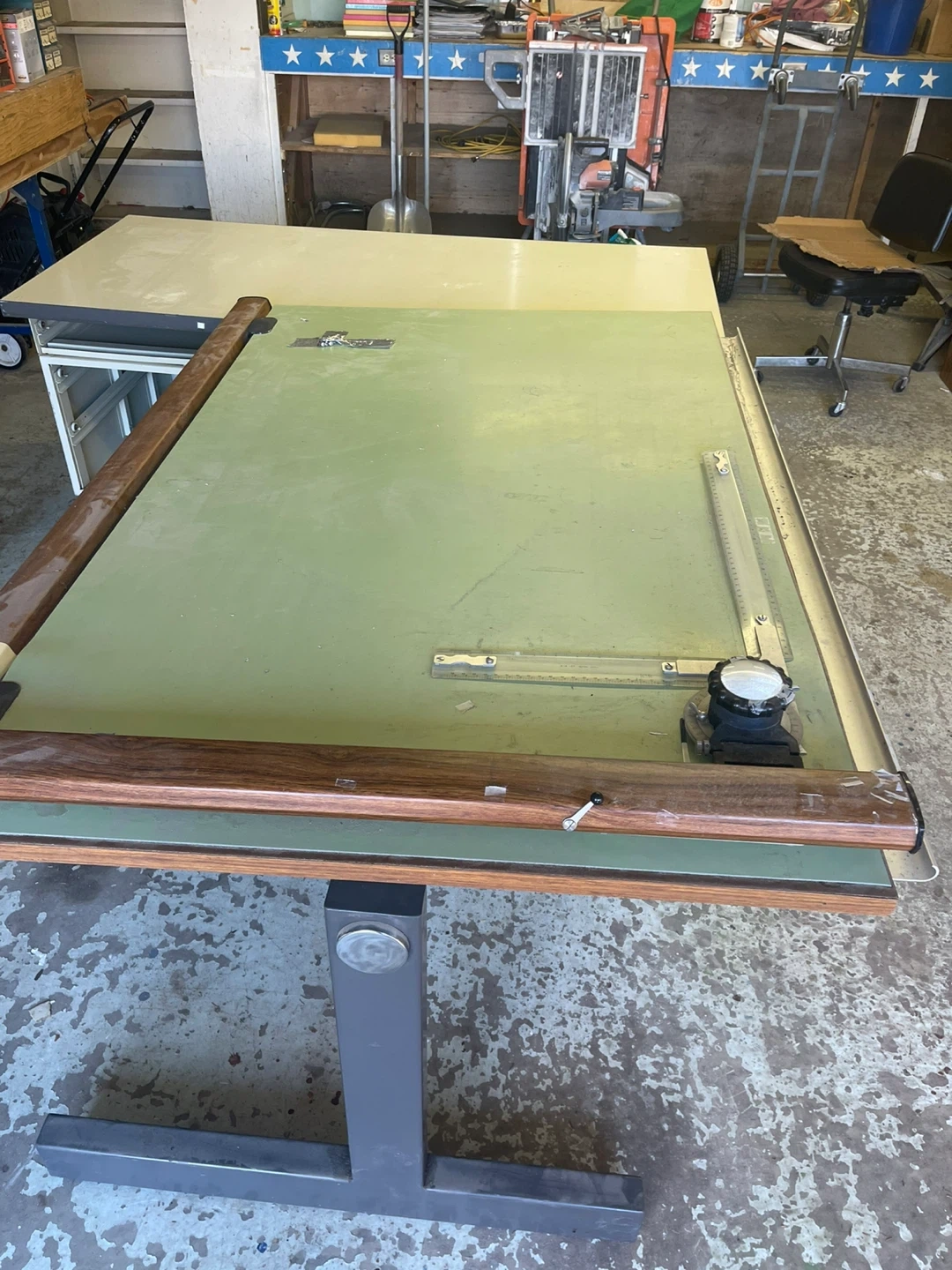 Adjustable drafting table with a large drawing board surface. It's built with a sturdy metal frame and includes two storage drawers underneath. The drawing board is hinged and can be tilted to various angles for comfortable use. Green table 5’ W x 45.5” D x 37” H. White table 67”W x 30”D x 30”H. No Delivery you will need a truck. Cash only