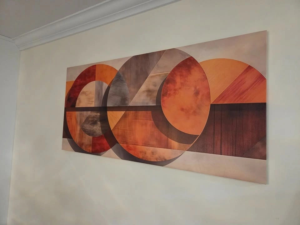 Bring warm, earthy vibes into your home with this striking geometric abstract canvas! This large 52x24" piece features a beautiful composition of interlocking circles and sharp lines in rich terracotta, burnt orange, warm browns, and cool greys. It is the perfect statement piece to complete your living room, bedroom, or home office. Whether your style is Mid-Century Modern, Boho, or Contemporary, the warm tones in this artwork will instantly make your space feel cozier and more stylized. Perfect Statement Size: 52 by 24 inches — a wide, horizontal layout that looks fantastic centered over a sofa, bed, or dining buffet. Condition: 100% Brand New. Printed on premium high-resolution canvas for sharp details and rich, fade-resistant colors. Completely borderless gallery wrap for a clean, edge-to-edge modern aesthetic. Surprisingly lightweight, making it incredibly easy to transport and hang on your wall without heavy-duty anchors. Let me know if you're interested!